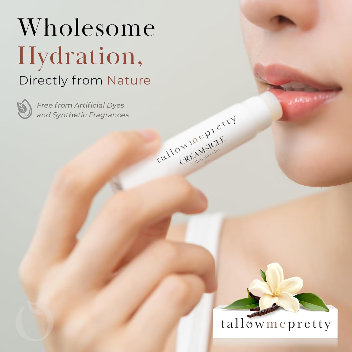 - Creamsicle Tallow Lip Balm: Pamper your lips with Tallow Me Pretty’s Creamsicle Moisturizing Lip Balm; Packed with rich, nourishing ingredients, this balm deeply repairs and protects dry cracked lips, delivering soothing relief and a silky-smooth finish