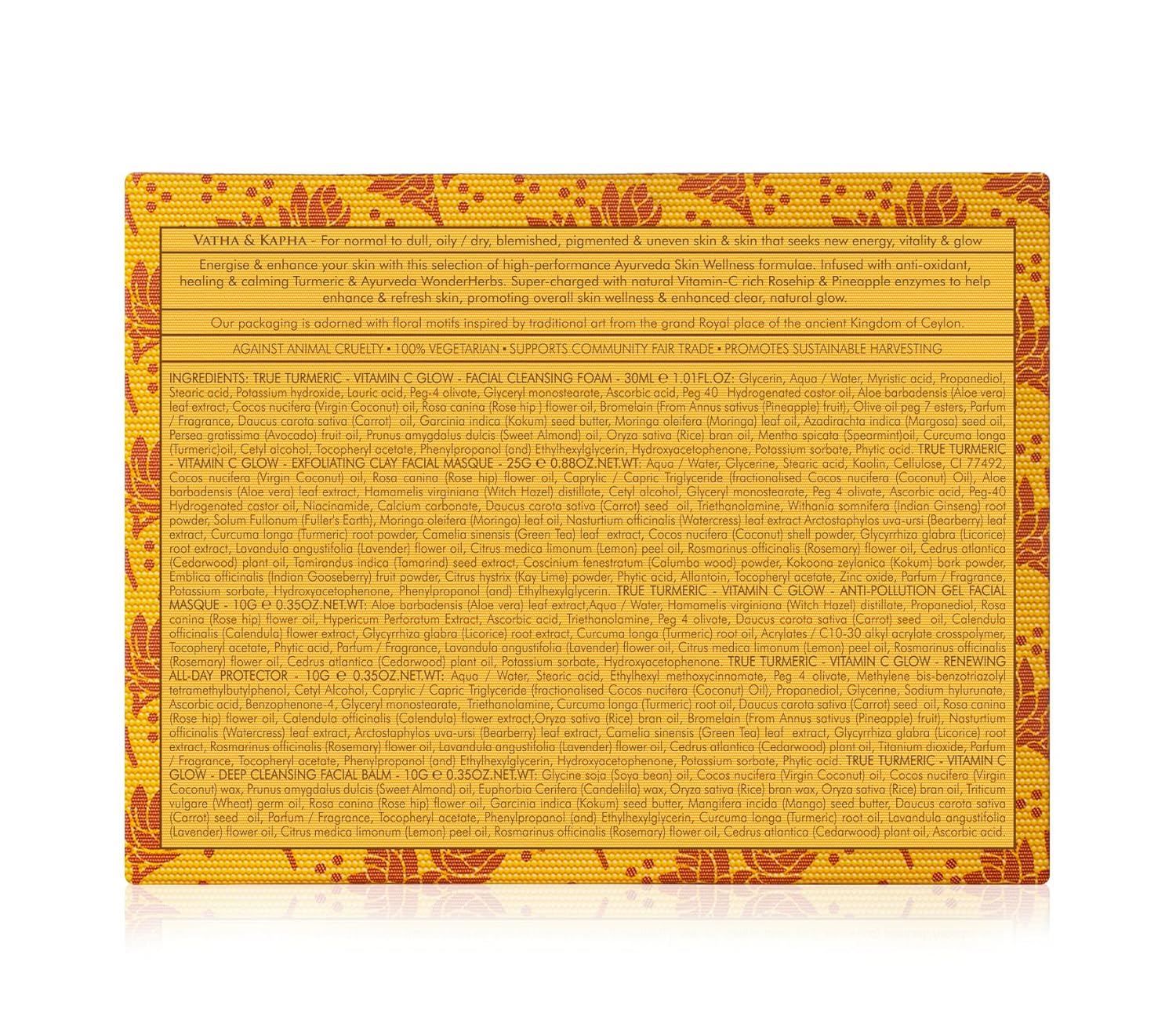 - 5-PIECE TURMERIC-INFUSED SET: Includes Facial Cleansing Foam (30ml), Exfoliating Clay Facial Masque (25g), Anti-Pollution Gel Masque (10g), Renewing All-Day Protector (10g), and Deep Cleansing Facial Balm (10g).