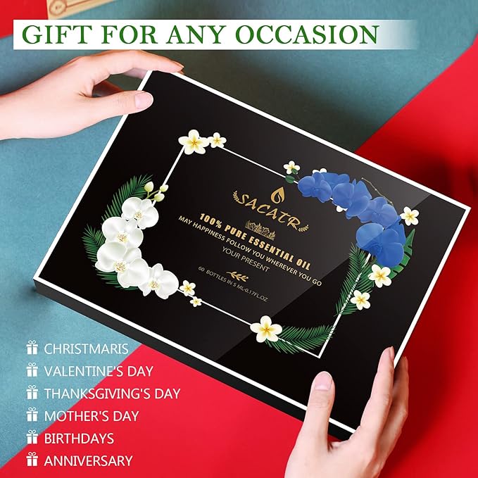 - 【Top 60 Essential Oils Gift Set】Our essential oil set includes 60 5ml/0.17oz bottles of aromatherapy essential oils, give you the most variety choose for different scenarios & needs. Including: Peppermint,Ylang Ylang,Sweet Orange,Eucalyptus,Rosemary,Lavender,Lemongrass,Patchouli,Chamomile,Tea Tree,Lemon,Rose,Jasmine, Bergamot,Cinnamon,Laurel,Vanilla,Geranium,White Tea ,Sandalwood and more.