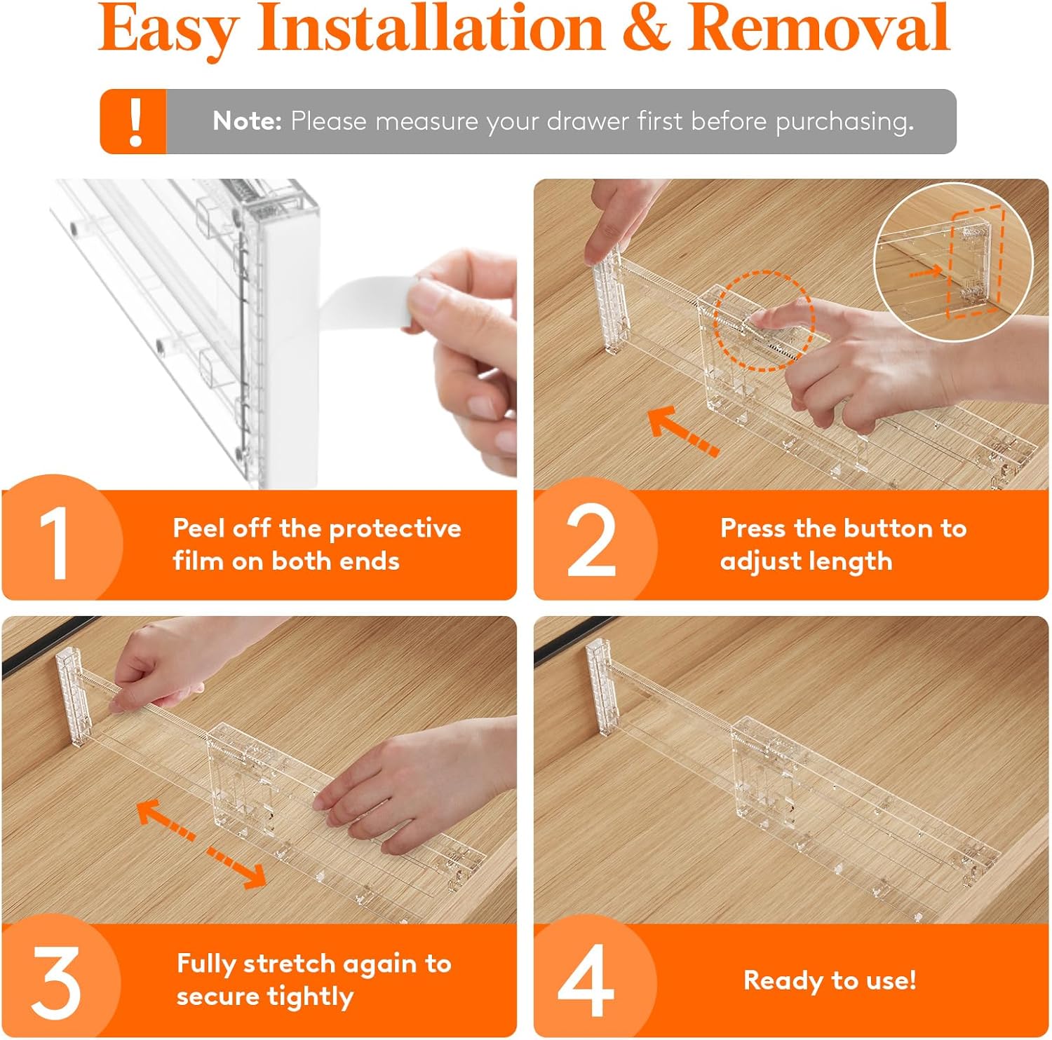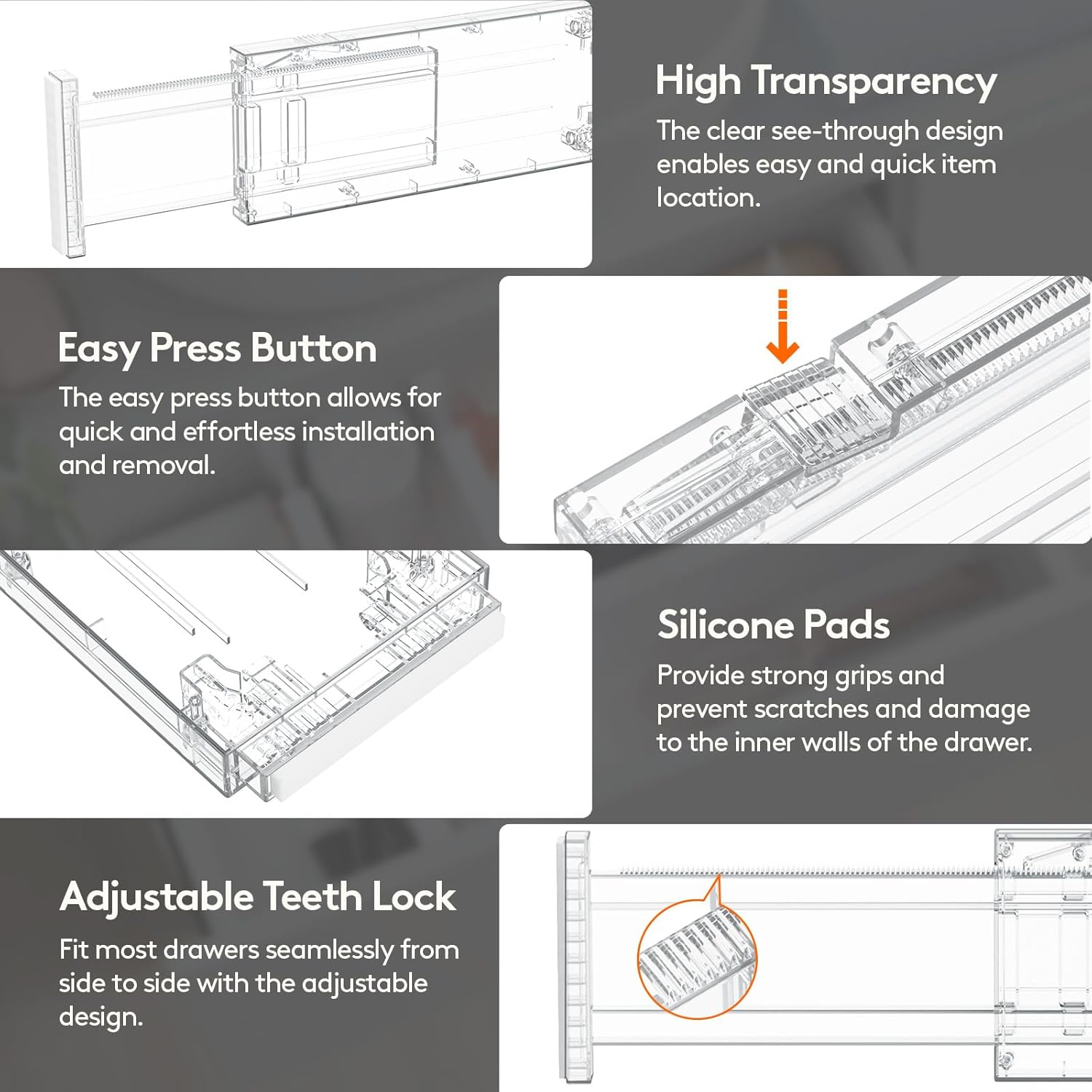 - High-Quality Material: Our dresser organizer is made from durable ABS material, complemented by high-quality silicone pads at both ends to protect the inner walls of your drawers from scratches or damage. It ensures stability without leaving any marks or residue behind