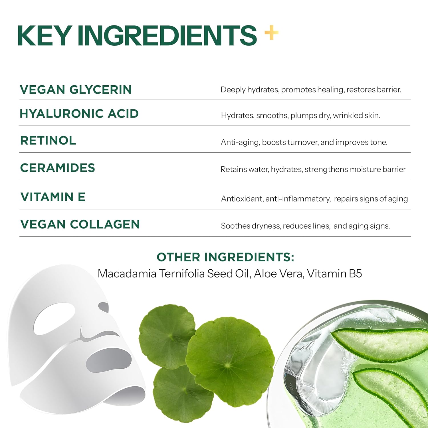 Retinol & Collagen Face Mask – 3-in-1: Detox, Treat, Boost – Hydrating, Firming, Anti-Aging – Dermatologist Tested Korean Skin Care – Clean Beauty Vegan Sheet Mask – 5 Sheets