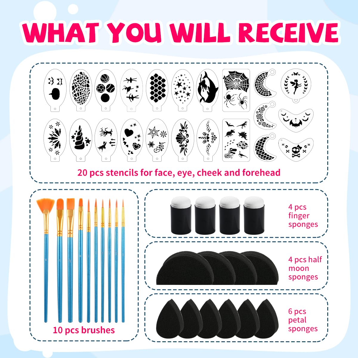 - 【Full Face Paint Accessory Kits】: there are 22 pieces of face painting stencils, 10 pcs professional face paint brushes, 6 pcs face paint petal sponges, 4 pcs half moon face paint sponges, 4 pcs finger sponges. One full face paint accessory kit meet all your needs. You can use template brushes to create perfect patterns by coordinating between sponges