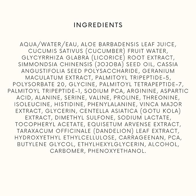- [ KEY INGREDIENTS ] Peptide Complex (Palmitoyl Tripeptide-5, Tetrapeptide-7, and Tripeptide-1), Organic Aloe Vera Leaf Juice, Cucumber Hydrosol, Organic Jojoba Oil, Botanical Hyaluronic Acid, MSM, Organic Periwinkle Extract, Licorice Root Extract, Vitamin E, and a blend of organic botanicals, including Gotu Kola, Horsetail Plant, Wild Geranium, and Dandelion Extracts.