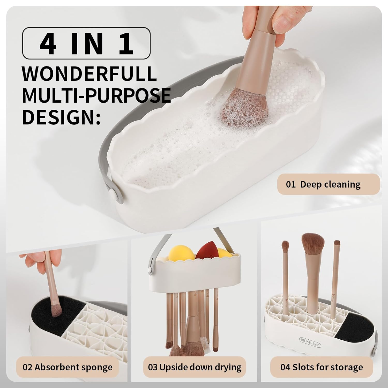 - 【4 in 1 DESIGN】 For brush storage, cleaning and drying. One side is like a bowl with multiple textures on the bottom to clean makeup brushes well, and the other side has many mesh sections of different shapes and sizes to hold makeup brushes large and small upside down for drying.