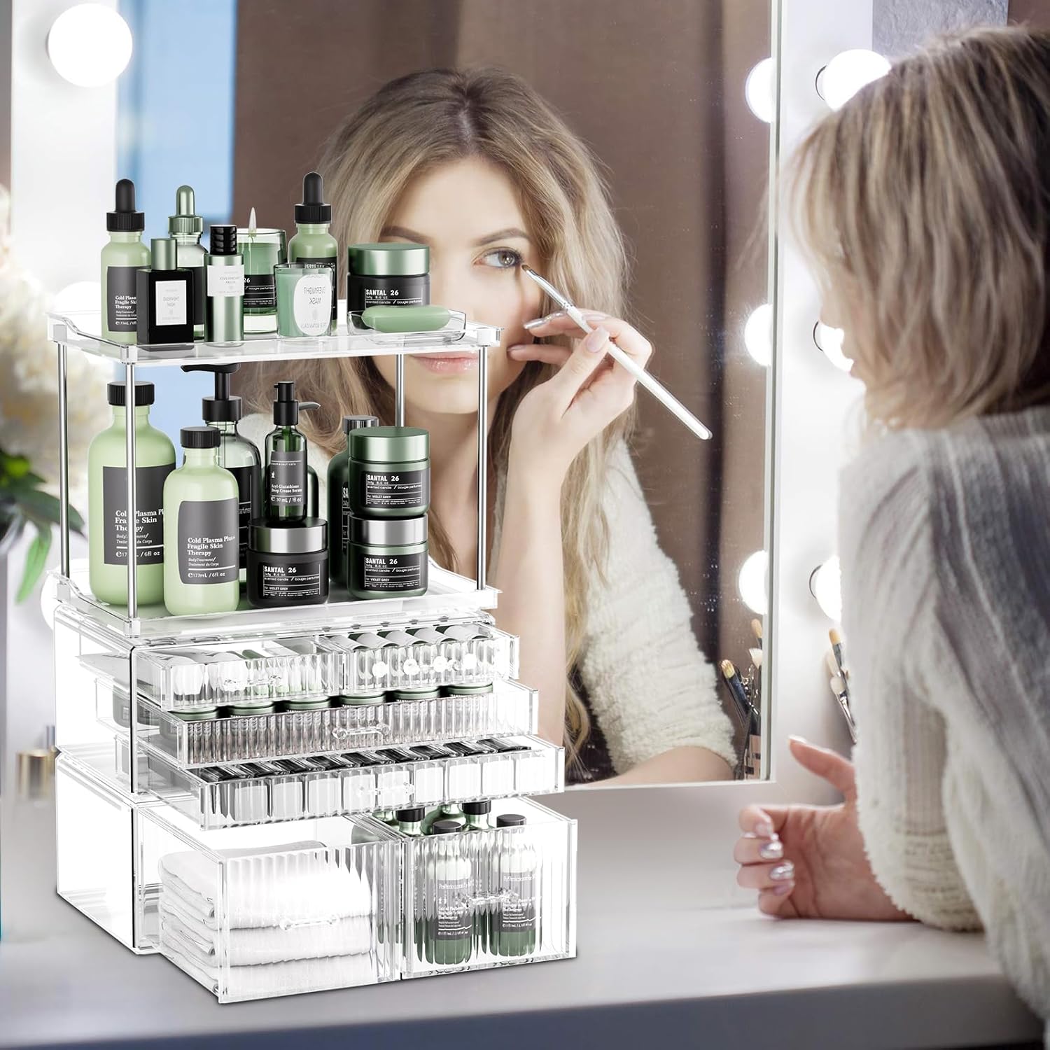 - Stylish Addition to Your Bathroom: Not only is this makeup organizer functional, but it's also stylish. Its sleek and modern design will complement any bathroom decor, adding a touch of elegance to your space. It's the perfect combination of form and function.