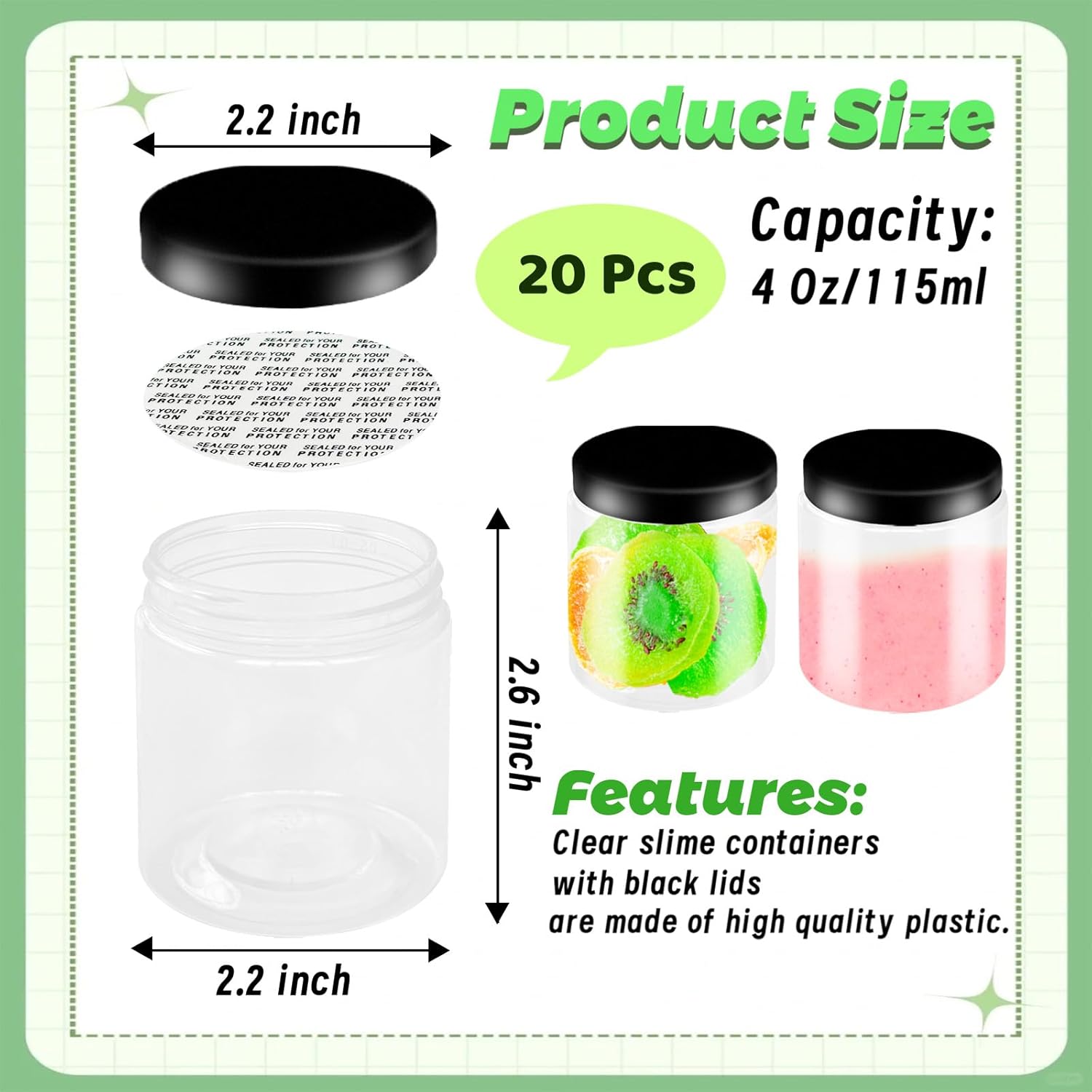20Pcs 4oz Plastic Slime Containers with Black Lids,Round Refillable Travel Storage Sealed Jars Clear Wide Mouth Container for Candy,Food Storage,Makeup,Cosmetics,Lotions,Eye Shadow,Cream,Samples