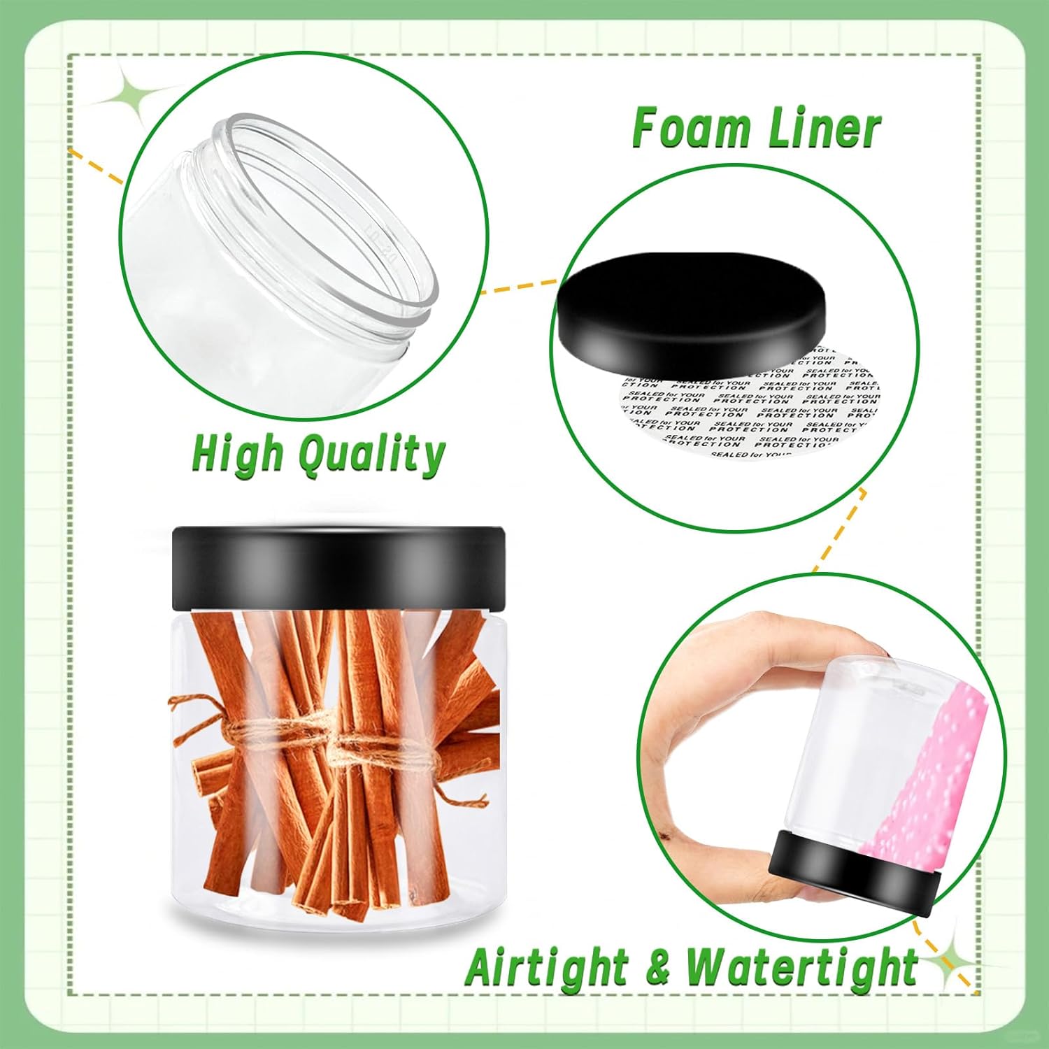 - Quality Material:You will get 20 packs plastic round jars with black lids.The travel stroage jar is made of plastic,applied for hair products,skin products,food,butter,anything you want to store.Clear jars display your contents