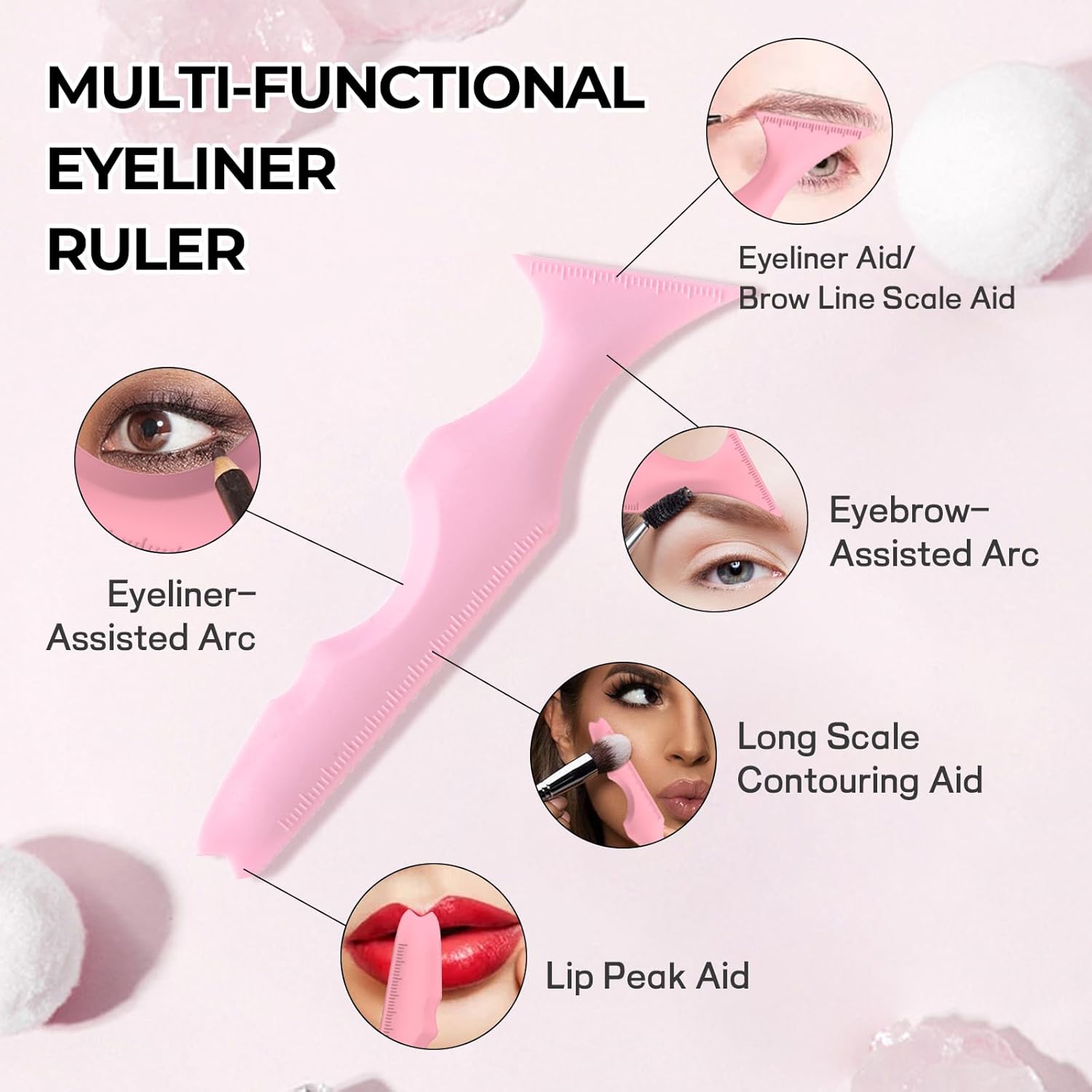 - FACE MAKEUP TOOL:Set includes eyeshadow tool, silicone beauty ruler and eyeliner aid, three eyeliner stencils for most eye contours. Use with a variety of eye makeup styles to help create a natural and clean makeup look.