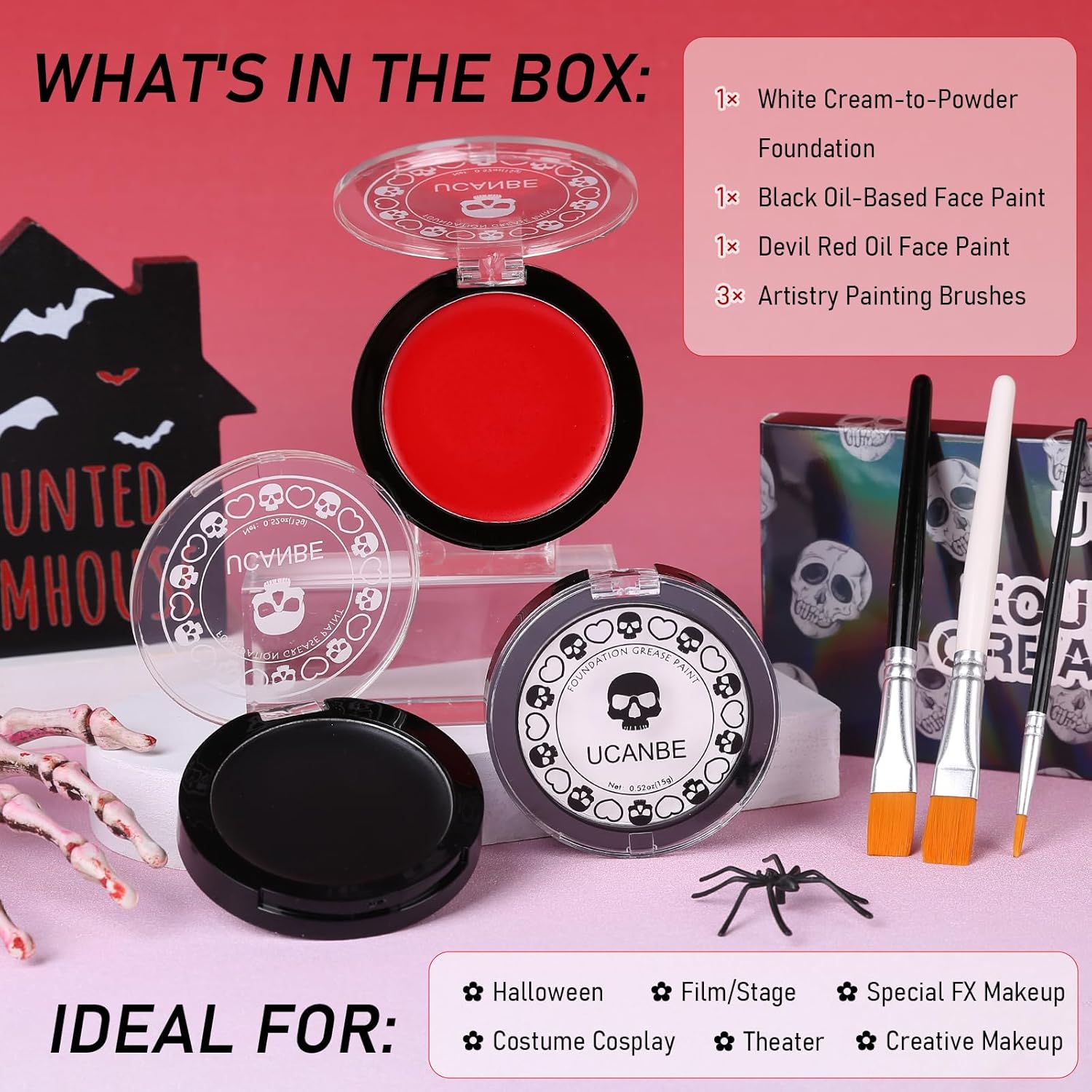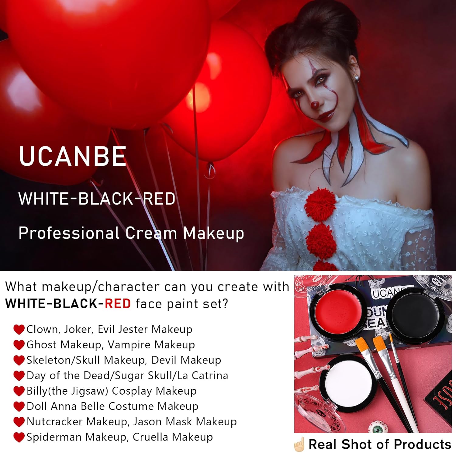 - 【White-Black-Red Face Body Paint Cream Makeup for Daily & Halloween】UCANBE face paint kit contains 3 colors professional face paints with 3pcs painting brushes. The white foundation face makeup paint is specially crafted with cream-to-powder formula that glides on like cream yet settles down to a matte finish. The black and red face paints, with silky texture, are oil-based cream makeup paints that goes on smoothly and easy to blend and layer for flawless opaque makeup. UCANBE White Pressed Setting Powder is highly recommended to set makeup quickly and last all day long