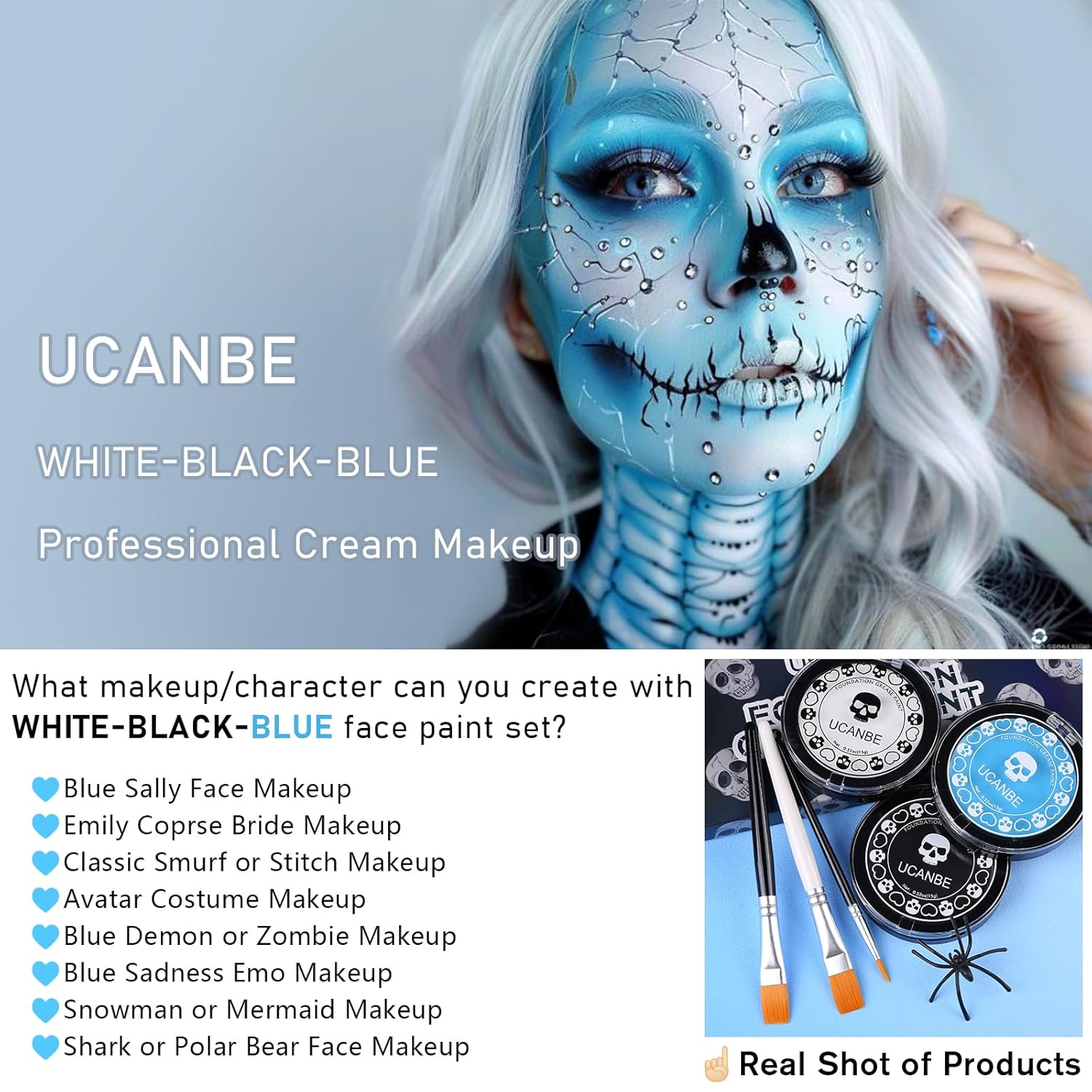- 【White-Black-Light Blue Face Body Paint Cream Makeup for Daily & Halloween】UCANBE face paint kit contains 3 colors professional face paints with 3pcs painting brushes. The white foundation face makeup paint is specially crafted with cream-to-powder formula that glides on like cream yet settles down to a matte finish. The black and light blue face paints, with silky texture, are oil-based cream makeup paints that goes on smoothly and easy to blend and layer for flawless opaque makeup. UCANBE White Pressed Setting Powder is highly recommended to set makeup quickly and last all day long