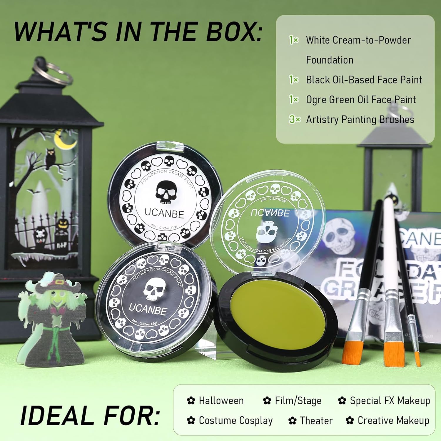 - 【White-Black-Ogre Green Face Body Paint Cream Makeup for Daily & Halloween】UCANBE face paint kit contains 3 colors professional face paints with 3pcs painting brushes. The white foundation face makeup paint is specially crafted with cream-to-powder formula that glides on like cream yet settles down to a matte finish. The black and green face paints, with silky texture, are oil-based cream makeup paints that goes on smoothly and easy to blend and layer for flawless opaque makeup. UCANBE White Pressed Setting Powder is highly recommended to set makeup quickly and last all day long