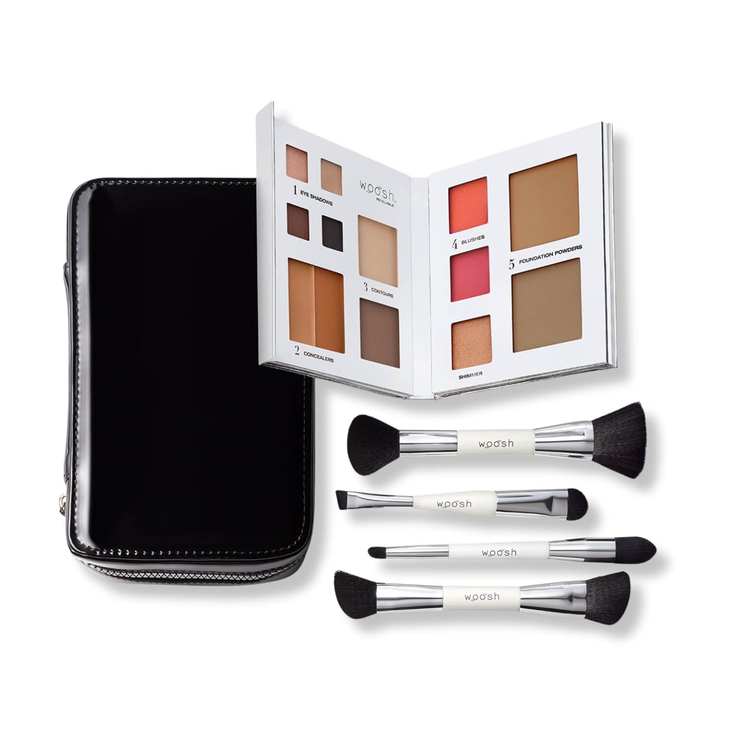 Woosh Beauty, Jetsetter Bundle in #4 Medium Deep, Fold out Face Original, Essential Brush Set, Travel Case in Black