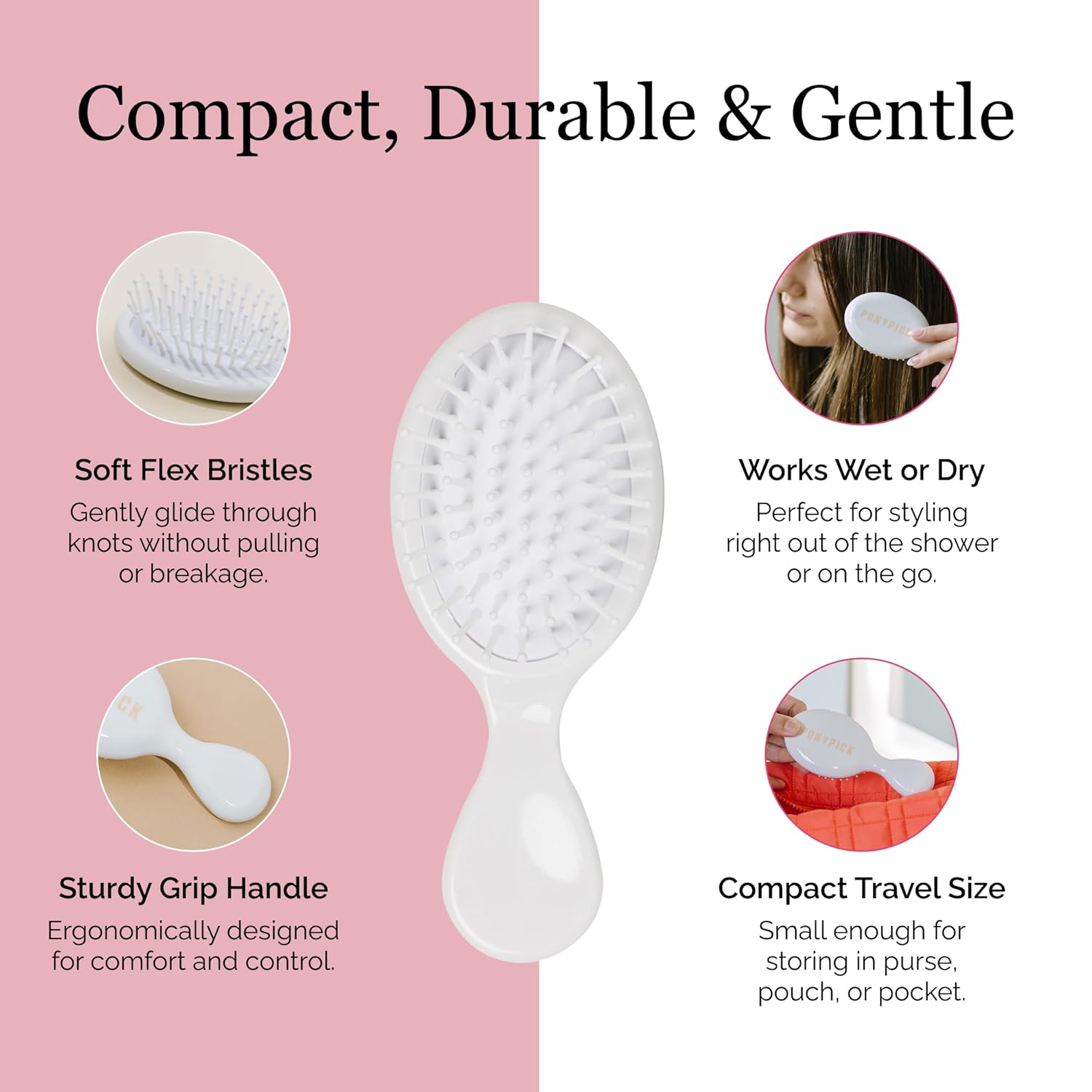 - AESTHETIC DESIGN - Durability combined with a tasteful design and neutral color, Pony Pick’s portable hair brush is truly designed to stand the test of time.