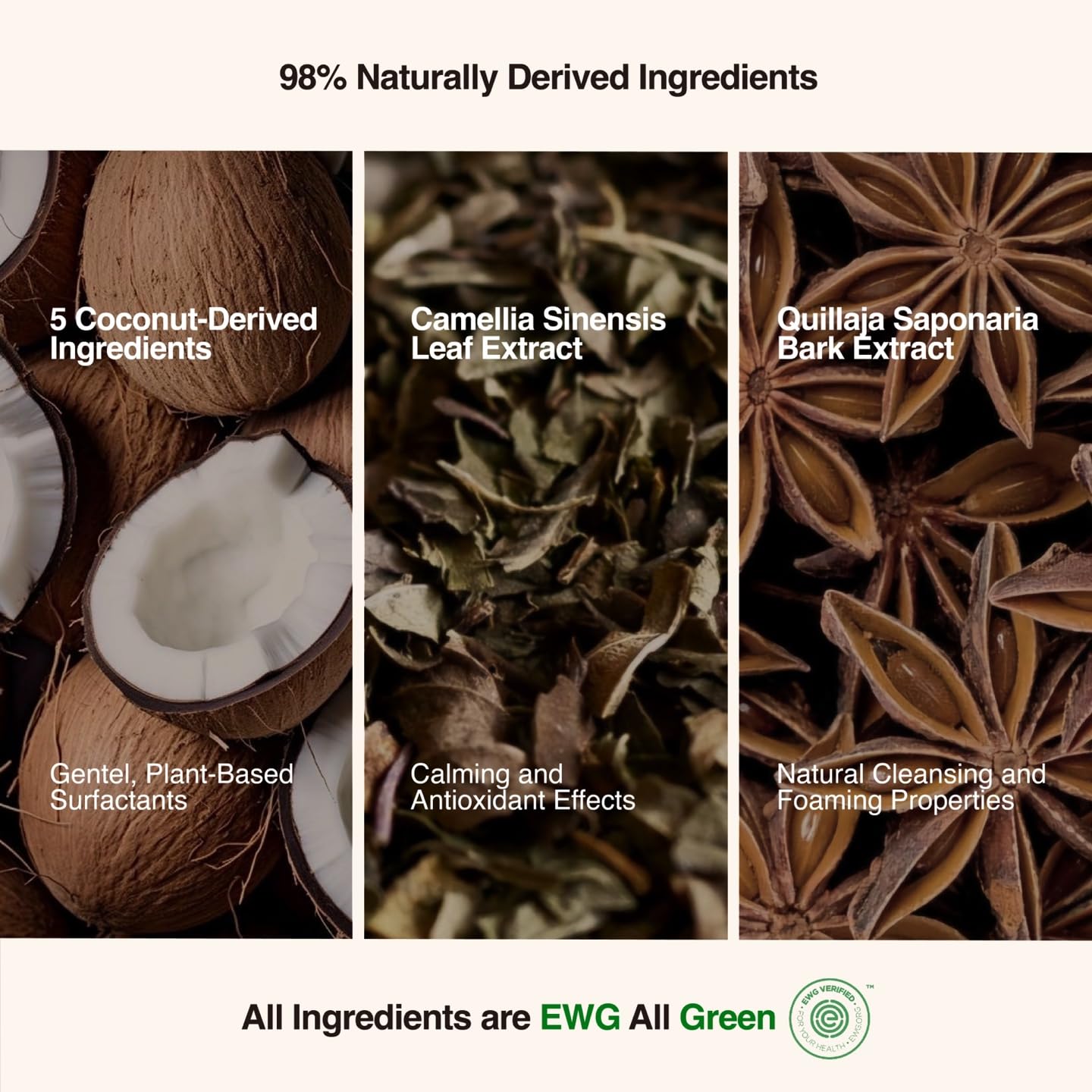 - 98% NATURALLY DERIVED INGREDIENTS WITH EWG GREEN RATING: Made with 5 coconut-derived surfactants, Camellia Sinensis Leaf extract, and Quillaja Saponaria Bark extract. Plant-based formula helps cleanse away dirt and oil while respecting the skin’s moisture barrier.
