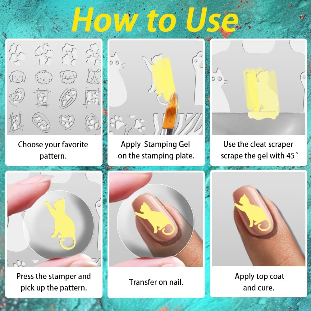- Package Information: A total of 3 templates, 1 nail stamp and scraper, cows, dogs, paw print, cats, zebra, butterflies patterns, randomly collocation, leading the nail fashion, the world at your fingertips jump