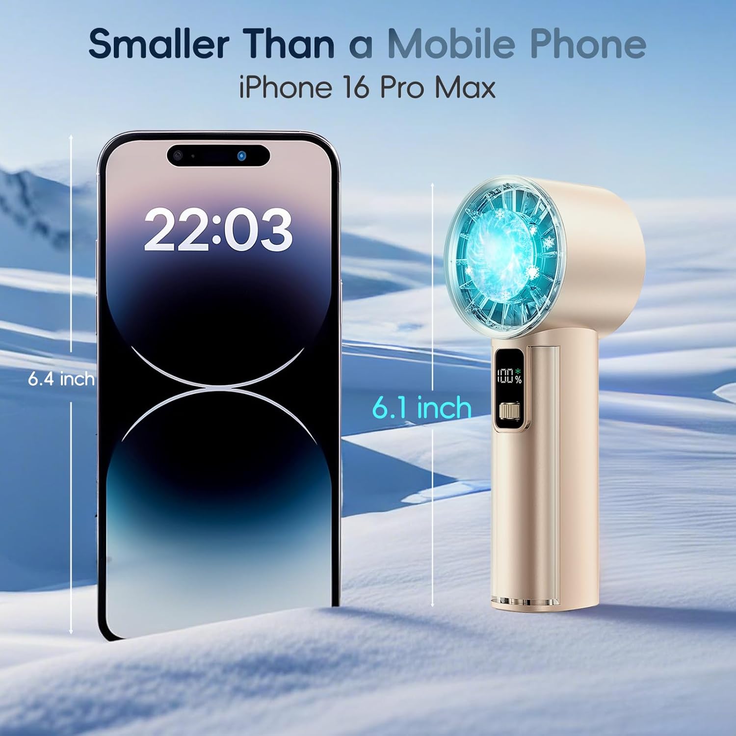 - Pocket-Sized, Feather-Light:Weighing just 0.48 lbs, this ultra-compact fan feels incredibly light and fits comfortably in the palm of your hand. At only 6.1 inches tall, it's even smaller than a smartphone, making it easy to hold and use. Slip it into your pocket, bag, or travel kit for convenient cooling on the go
