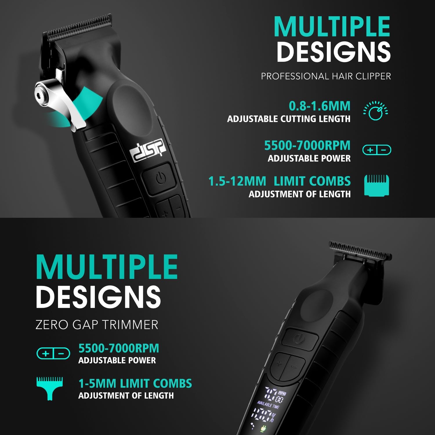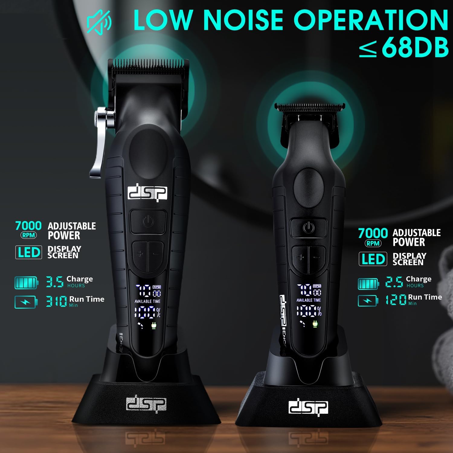 DSP Professional Hair Clippers Set for Men, Cordless Barber Clipper Beard Trimmer DLC, USB Rechargeable, Speeds Adjustable, Travel Lock, Low Noise with Charging Base