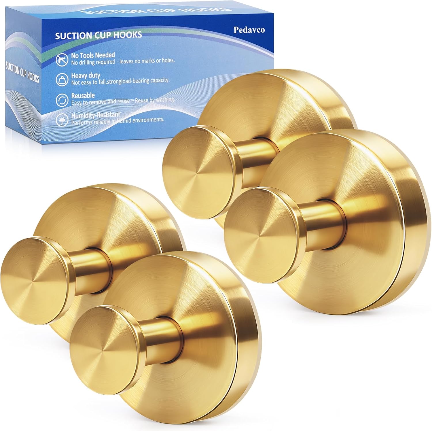 Suction Cup Hooks for Shower No Drill - Heavy Duty Stainless Steel Bathroom Hooks, Wall Mounted for Towels, Robes, Loofah - Works on Tile, Glass, Mirror, Kitchen (Gold, 4 Pack)