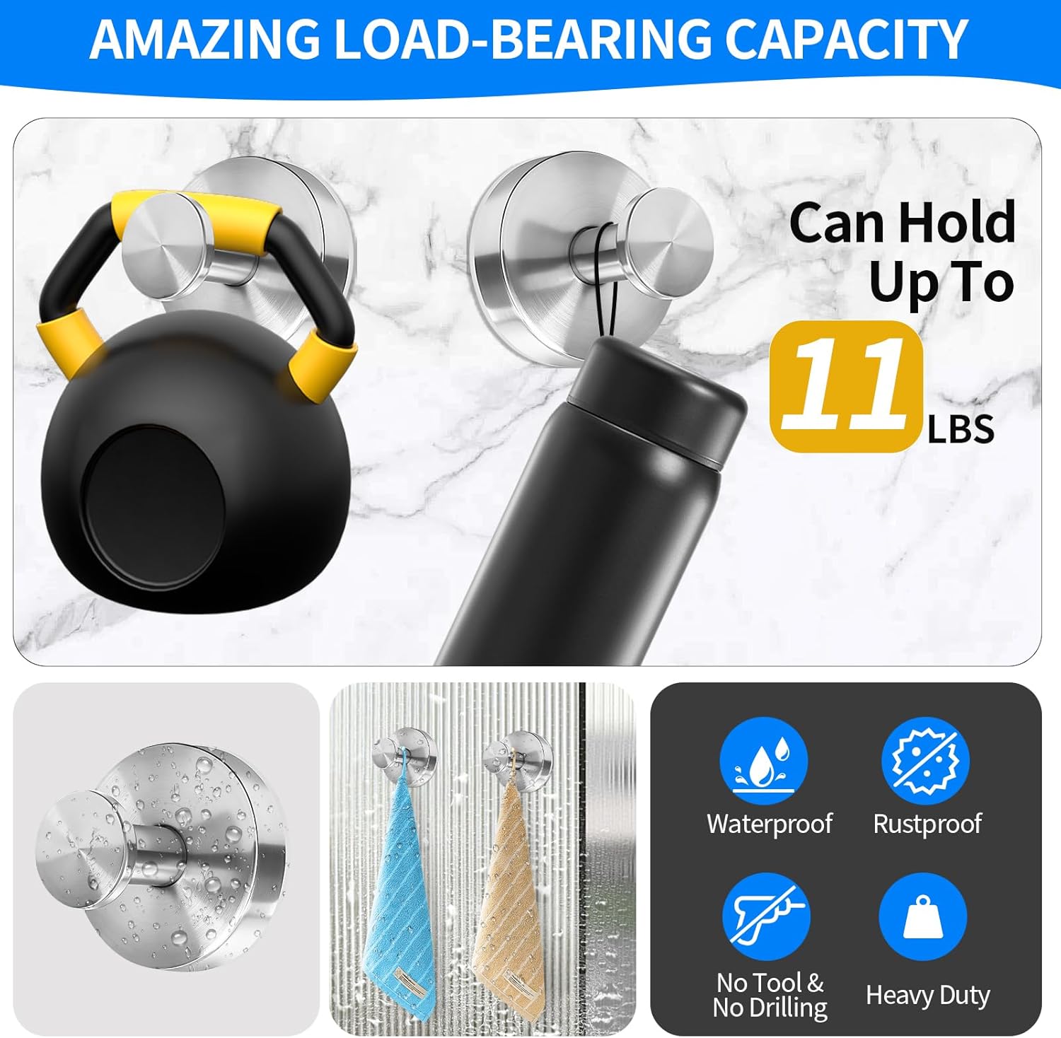 - No drilling required: These stainless steel suction cup hooks create a strong, instant grip on smooth surfaces like glass, tile, or mirrors. Ideal for towels, robes, and coats, they are designed to hold up to 11 lbs when properly installed, without damaging walls.