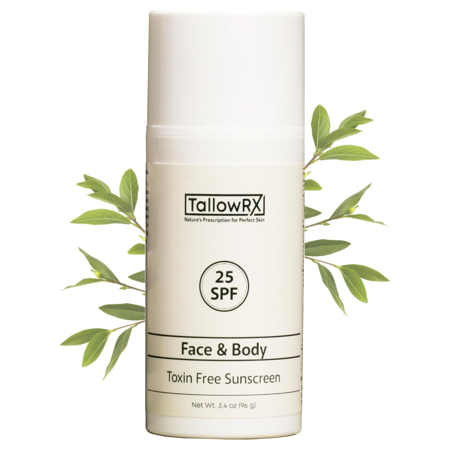 Tallow Sunscreen SPF 25 with Non Nano Zinc Oxide – Natural Mineral Sun Protection with Red Raspberry, Coconut Oil & Vit E – Reef Safe, Non Toxic & Moisturizing Sunblock for Face & Body – 3.4 oz