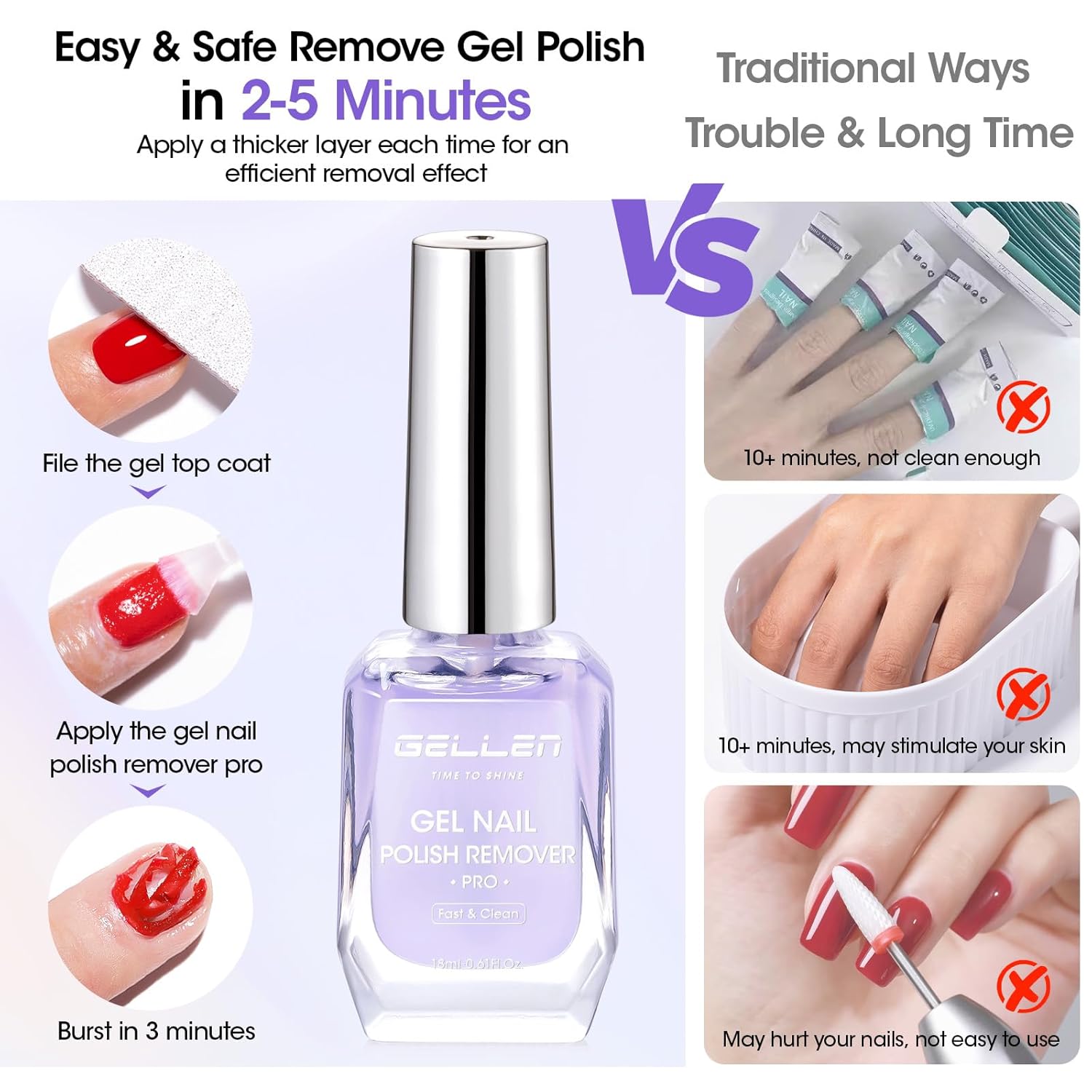 - 【Fast-Acting Gel Nail Polish Remover】Gellen gel nail remover pro works within 2–5 minutes to quickly break down stubborn gel polish. No soaking, wrapping, or scraping needed—just apply and let the formula do the work.