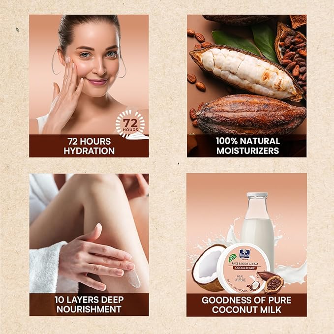 - Goodness of Coconut & Cocoa: Formulated with pure coconut milk, Cocoa Beans, and 100% Natural Moisturizers, this cream provides intense 72-hour moisturization to your skin, making it suitable for very dry skin types.