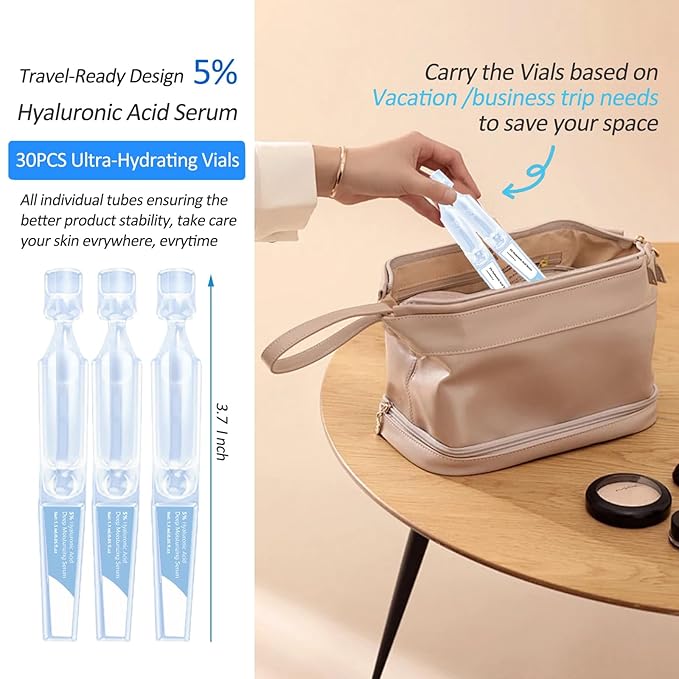 - Single-Use Hyaluronic Acid Tubes: All Our 5% Hyaluronic Acid Serum Ultra-Hydrating Vials are individual packaging. With 1.2ml x 30 pcs per box, ensuring better product stability, portable & easy to use on-the-go