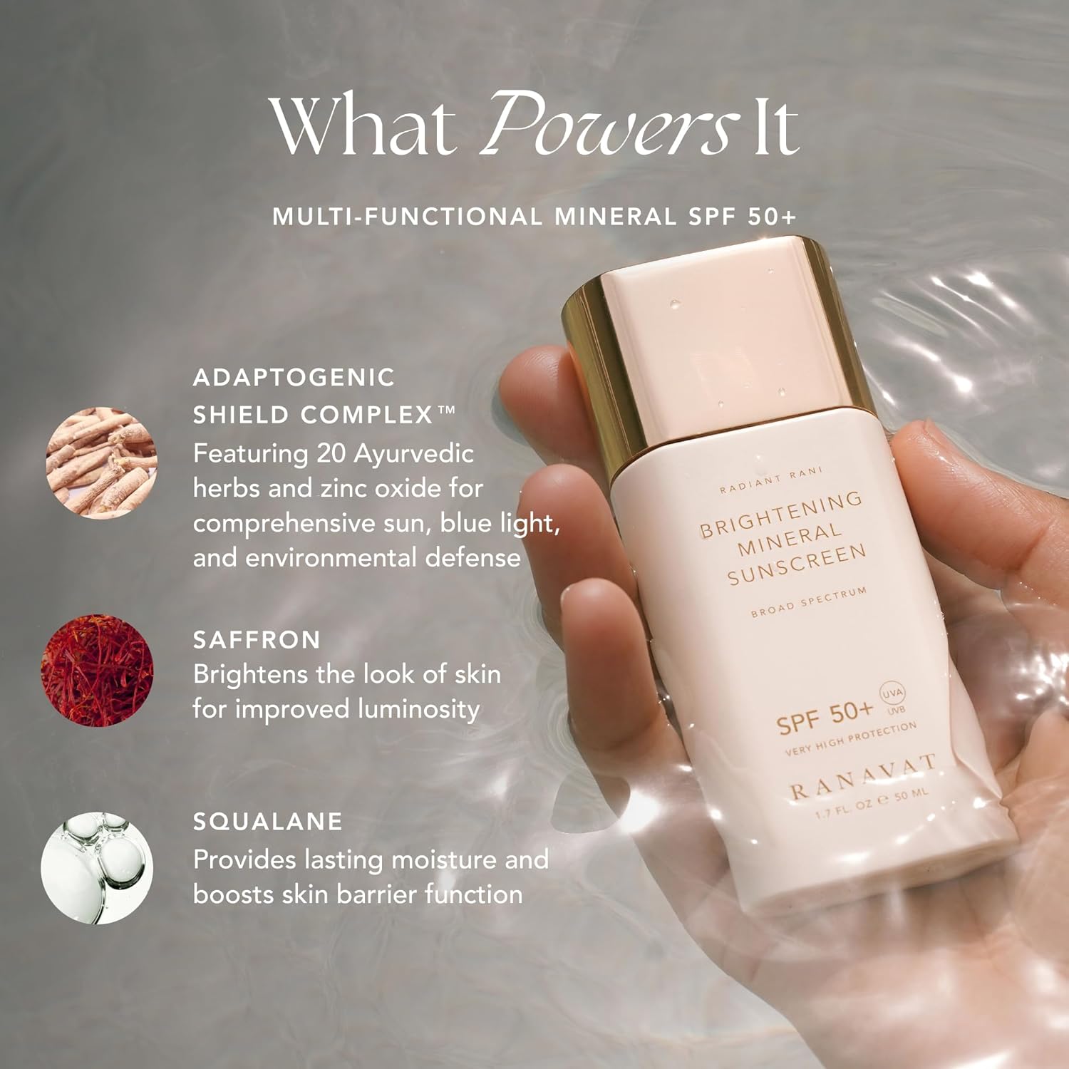 - Key Ayurvedic Ingredients - This facial sunscreen is formulated with our Adaptogenic Shield Complex™ which combines adaptogens with zinc oxide for complete protection from UVA/B, blue light, and skin-damaging free radicals. Squalane strengthens your skin's moisture barrier, while saffron brightens and increases radiance without white cast.