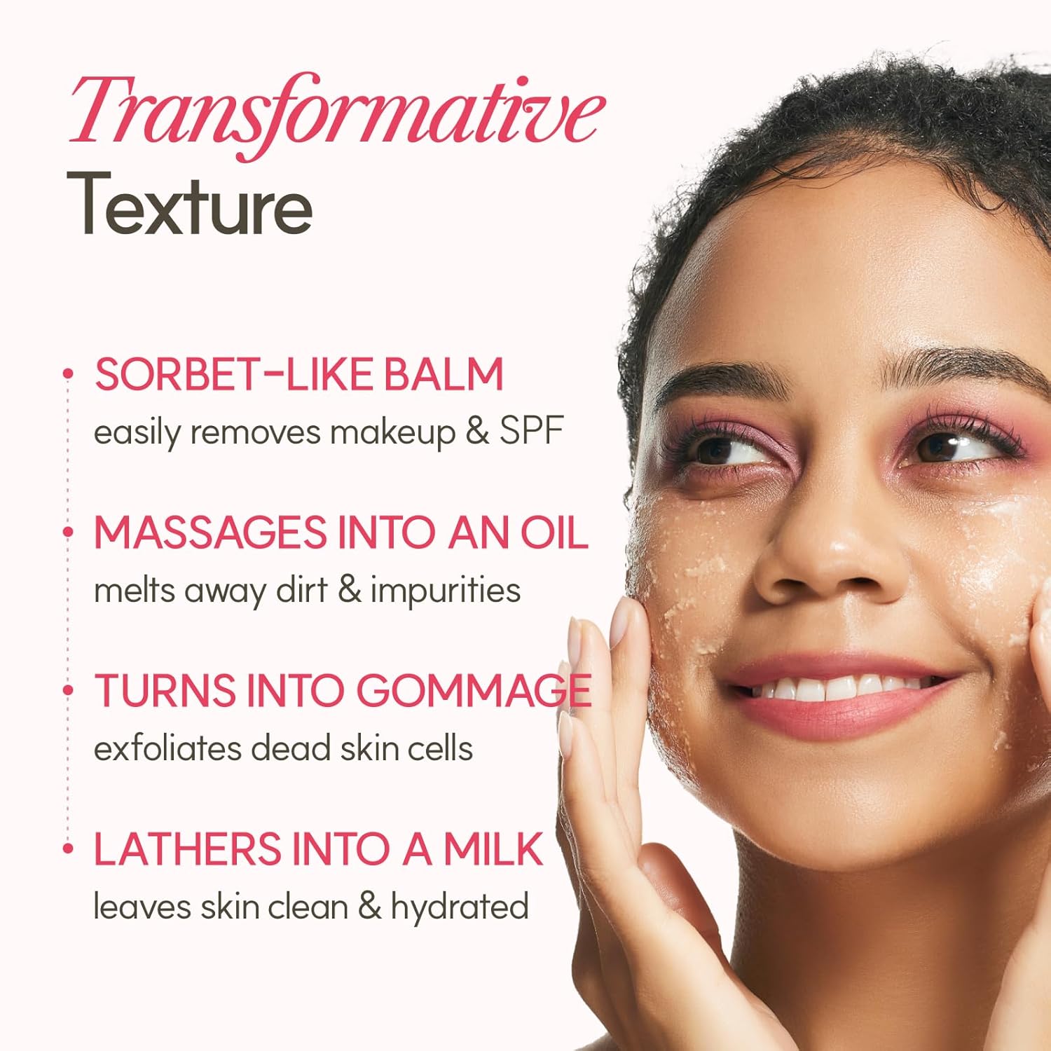 - [4 TRANSFORMATIVE TEXTURE] This cleansing balm stays a sorbet-like solid in the jar until it makes contact with skin and transforms into a silky oil (then a gommage, and then milky lather!). Non-comedogenic.