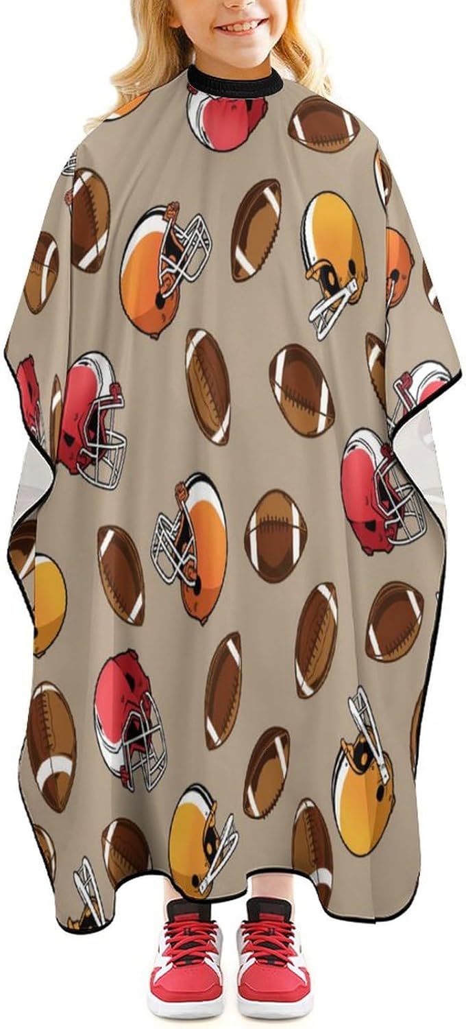 - CARTOON BARBER CAPE DESIGN: Footballs Print barber cape has a certain waterproof ability and will not get the child's clothes wet during hair washing or hair dyeing. The fabric is smooth, doesn't stick to your hair, and cleans up very easily. Just shake the hairdresser's apron gently to remove broken hair.