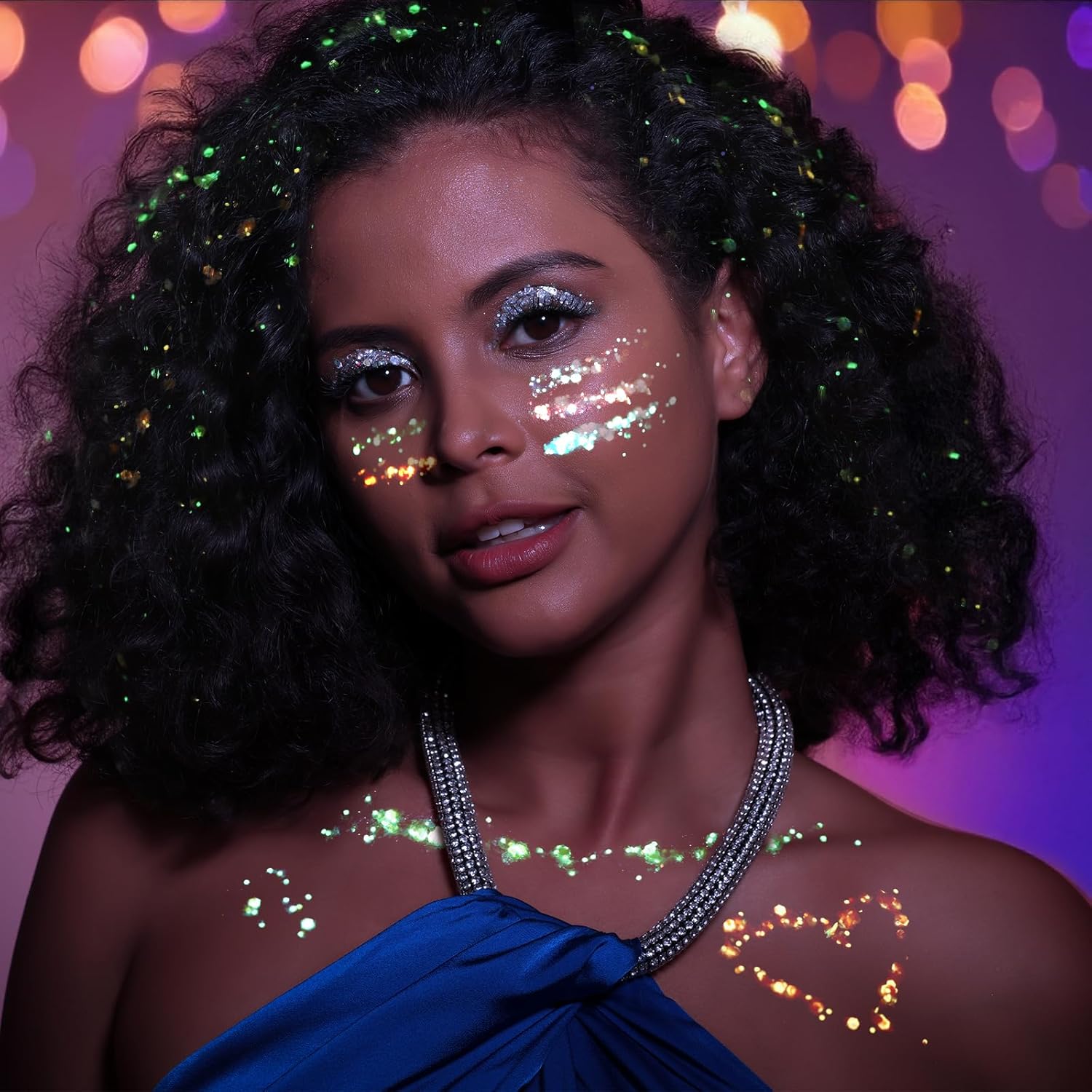 - Festival Makeup Glitter Gel: Perfect for festivals, parties, cosplay, or Halloween, the set combines 12 bold festival makeup glitters and 12 long-lasting glow-in-the-dark body gels. Whether you’re adding sparkle to your eyes, lips, or hair, or glowing under blacklights, this kit has you covered