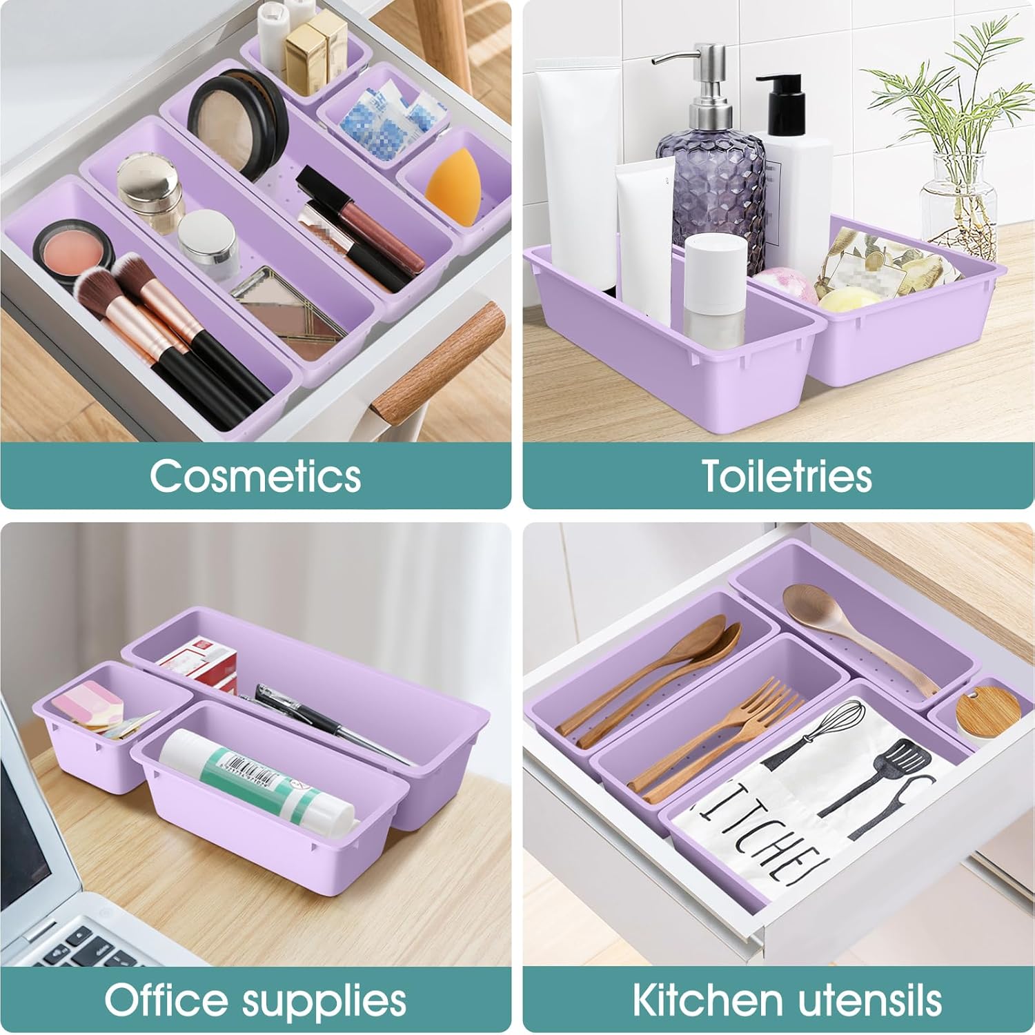 WOWBOX 25 PCS Plastic Drawer Organizer Set, 4 Sizes Desk Drawer Divider Organizers and Storage Bins for Makeup, Jewelry, Gadgets for Kitchen, Bedroom, Bathroom, Office, Purple