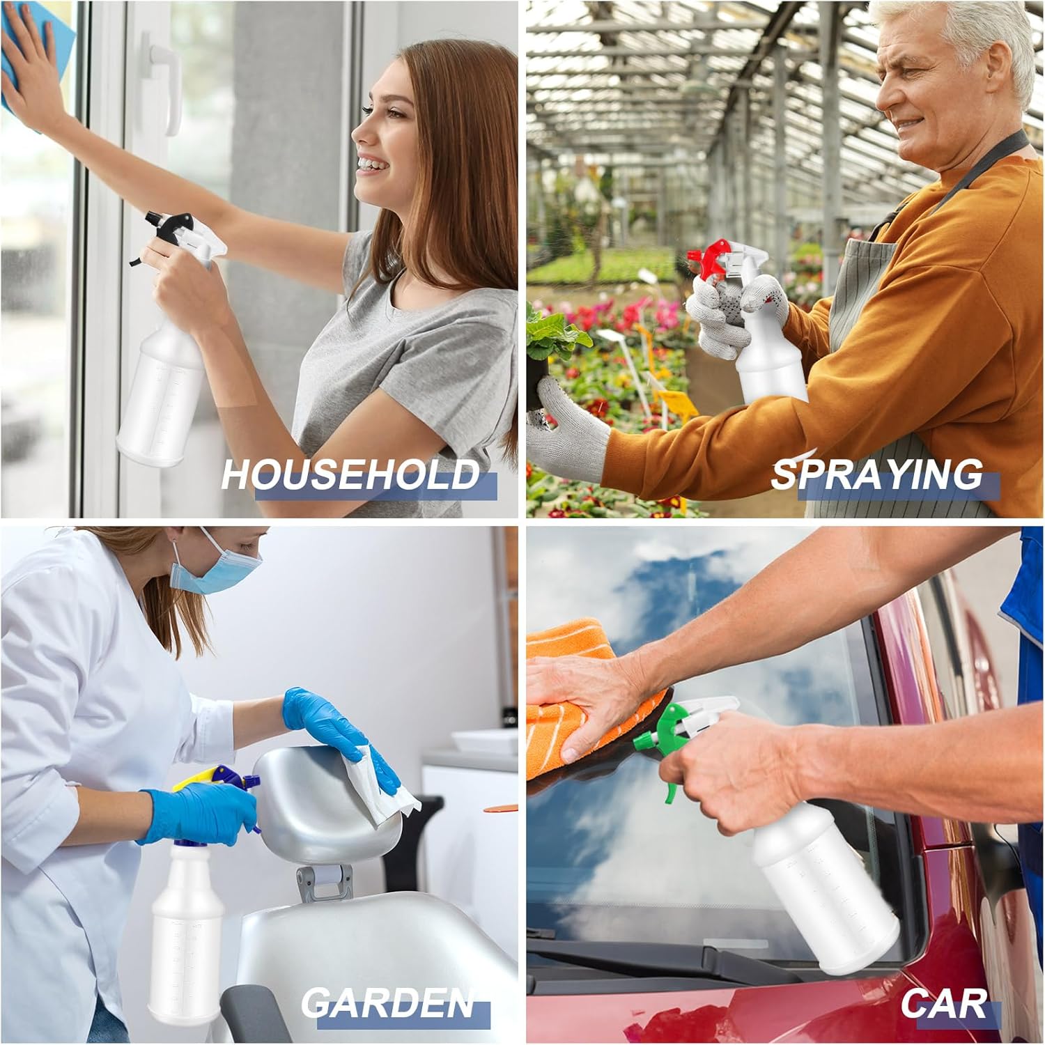 - Multifunctional Cleaning Bottles: our spray bottles are large capacity and dense spray, ideal for household, pet, car detailing, cleaning disinfecting, hairdressing, misting and watering plants, ironing, laundry, BBQ, and spraying the body, etc.; Homemade DIY spray bottle
