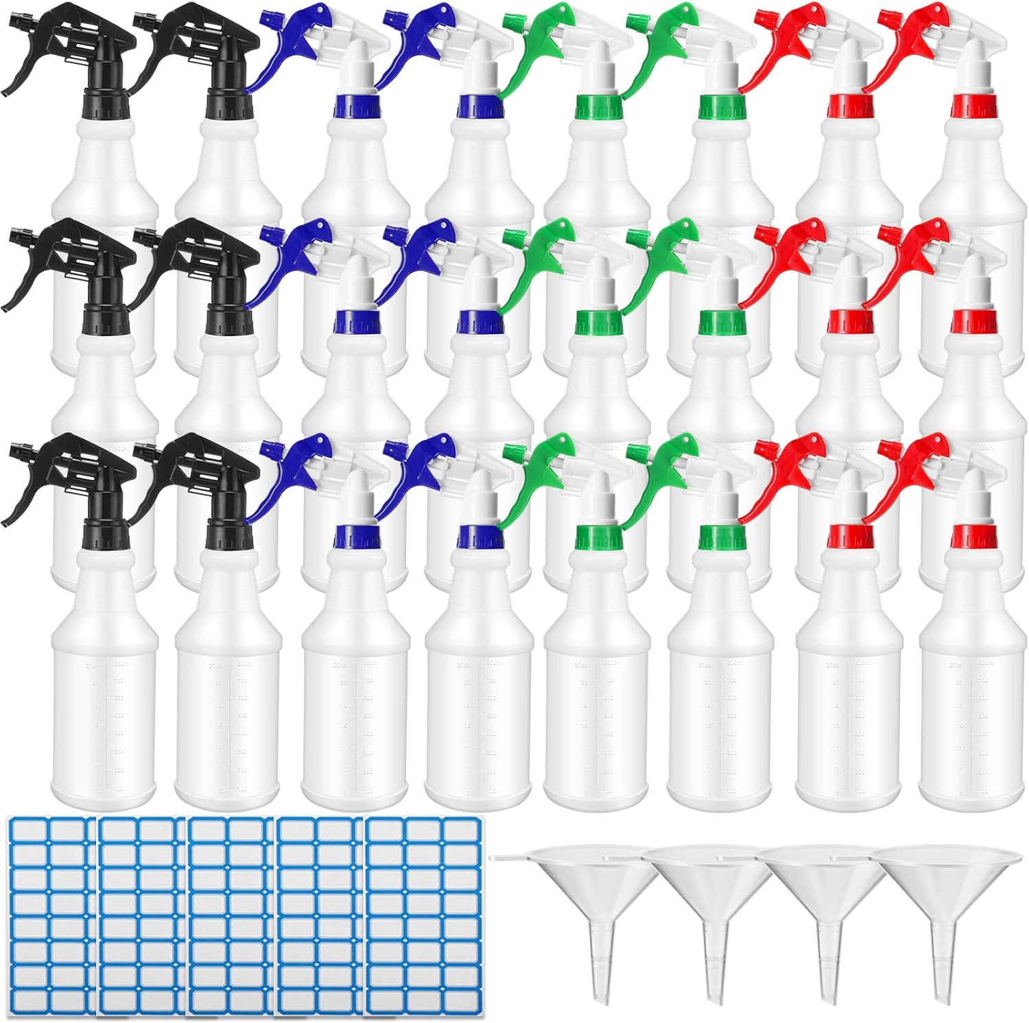 - Value Pack Spray Bottles Set: you will receive 24 pieces of 32 oz (1000ml) water spray bottles, 5 label stickers, and 4 plastic funnels, practical combination and rich content to meet your use and replacement needs, you can also share them with your friends or family