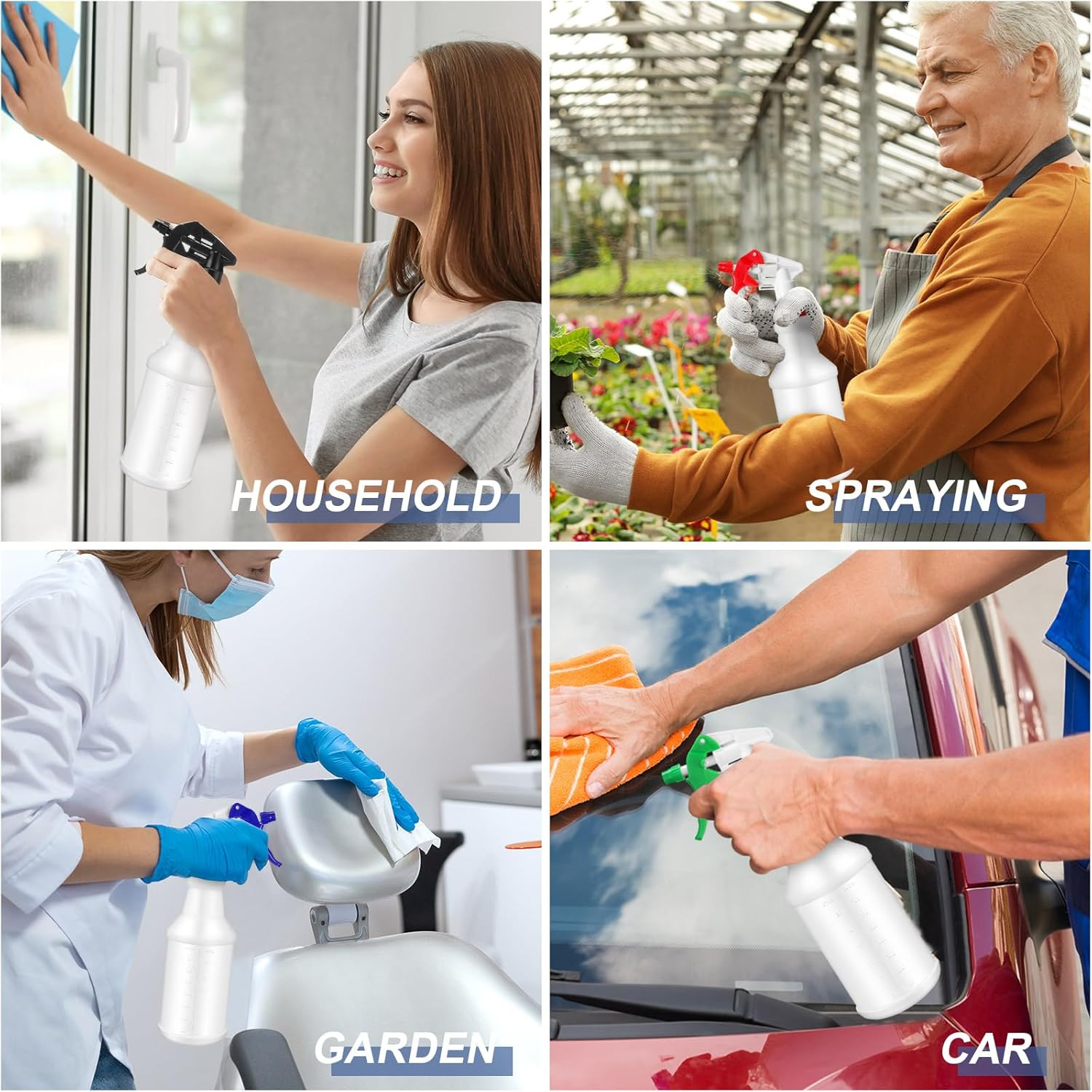 - Multifunctional Cleaning Bottles: our spray bottles are large capacity and dense spray, ideal for household, pet, car detailing, cleaning disinfecting, hairdressing, misting and watering plants, ironing, laundry, BBQ, and spraying the body, etc.; Homemade DIY spray bottle