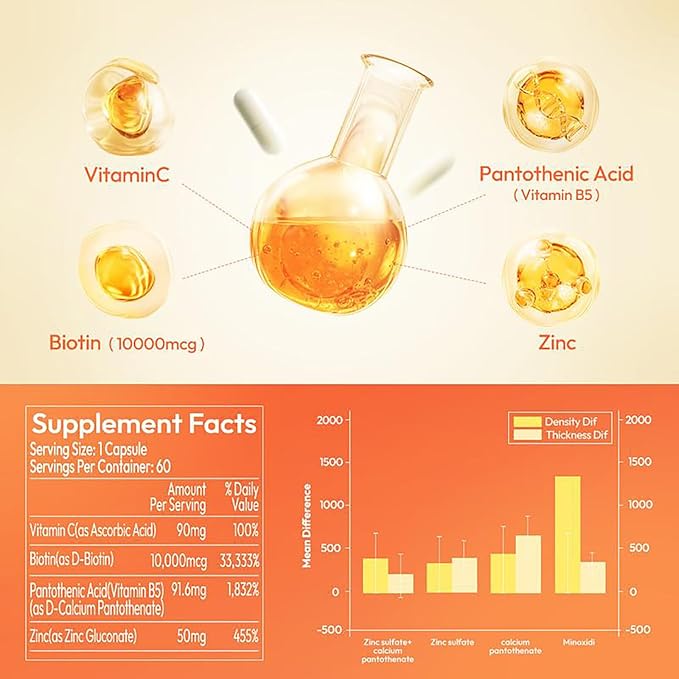 - Comprehensive Hair and Skin Benefits: Our scientifically backed formula provides 10,000 mcg of Biotin to stimulate hair growth, Zinc for healthy nails, Vitamin C for youthful skin, and Calcium Pantothenate to support hair thickness and combat hair loss.