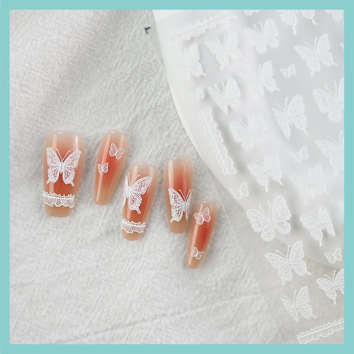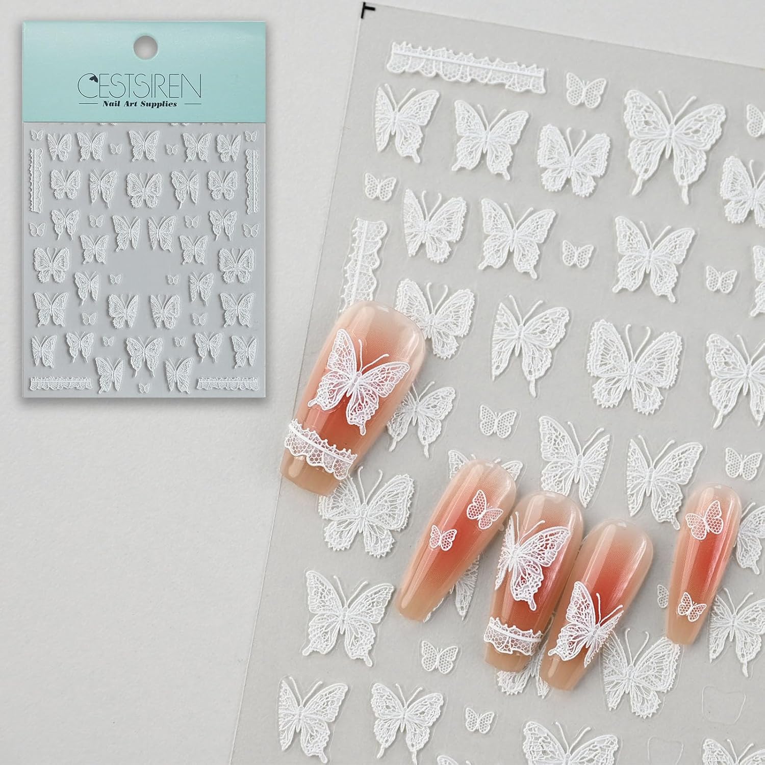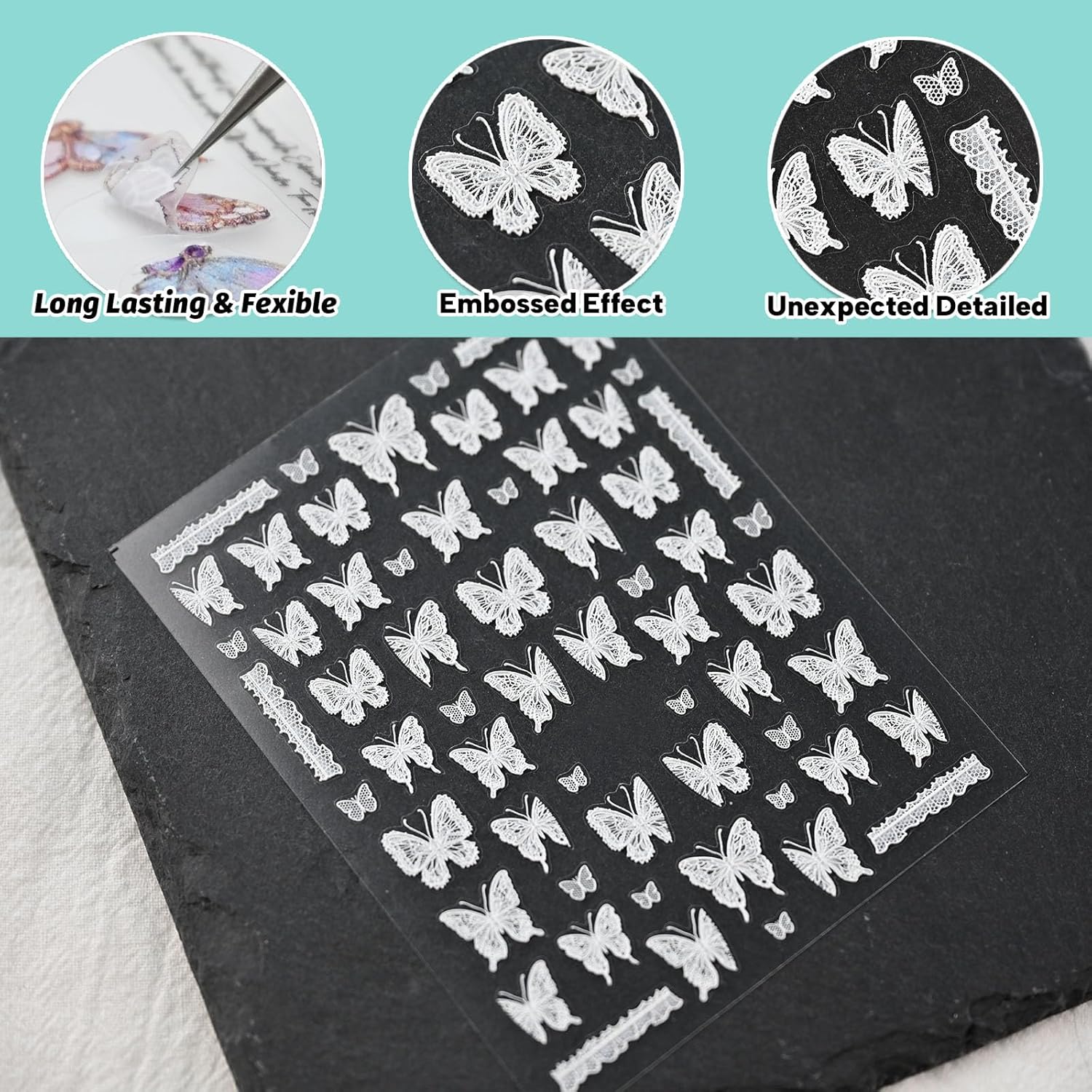 Lace Butterfly Nail Art Stickers, Embossed Nail Decals,Self-Adhesive, White Nail Accessories for Women, Nail Decorations