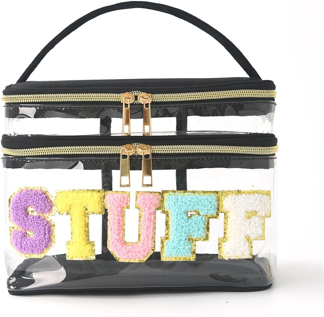 FITINI Makeup Bags Chenille Double Layer Travel Storage Cosmetic Cases Make up Organizer Toiletry Bags Stuff for Women Makeup Brush Bag,Clear Black