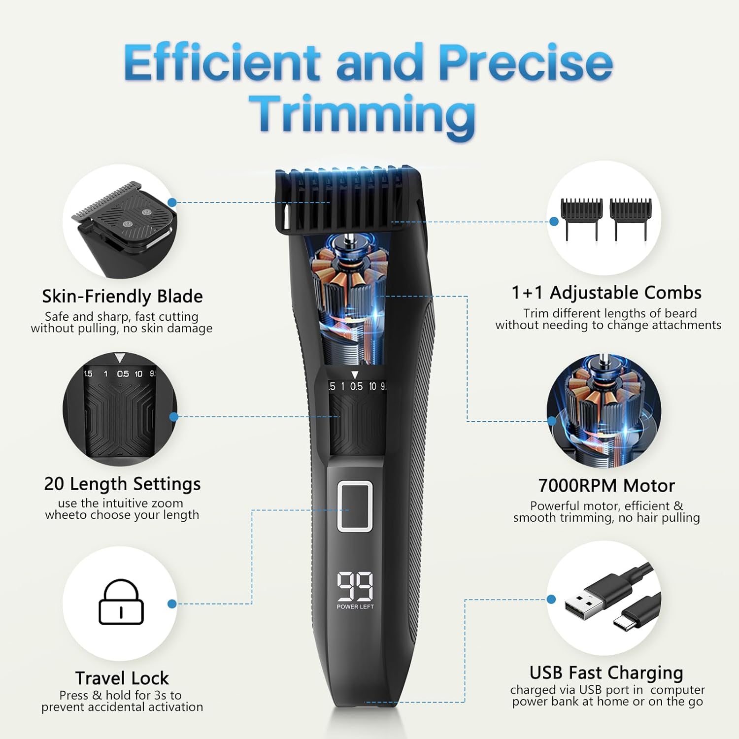 - USB Chargable & LED Display: Men's face and body trimmer with humanized LED display shows the remaining battery level and reminds you to recharge in time, a high-performance battery life provides up to 60 mins of cordless use after 1.5 hours full charge,men's beard trimmer equipped with Type-C charging device, can be charged via USB port in your computer, power bank at home or on the go, fast charging, cordless design for easy to carry, delivers a smooth and comfortable trimming experience