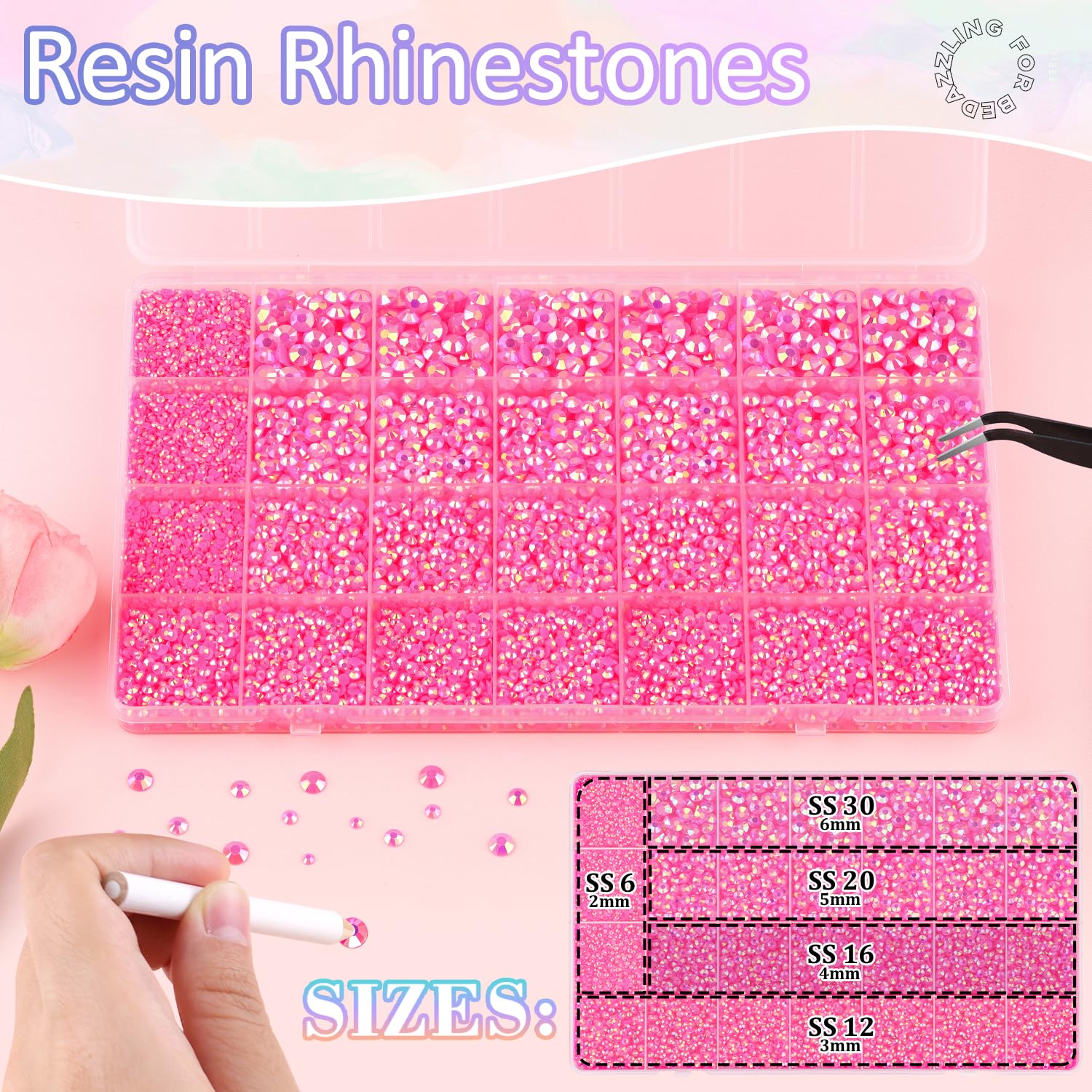 - PACKAGE CONTENT -- Include 1 box with 28 grids, featuring a variety of sizes, approx. 30000 pcs bling-out resin rhinestones (Hot Pink AB). 1 tweezers and 1 pickup pen are included for easily picking up of rhinestones. 3 B7000 glue for jewelry making