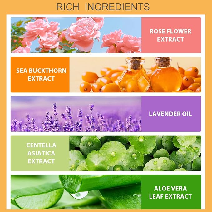 - 【Natural Ingredients】Contains lavender oil, sea buckthorn extract, rose flower extract, centella asiatica extract, and aloe leaf extract. It can balance the pH value of the epidermis, making the skin healthier and more radiant