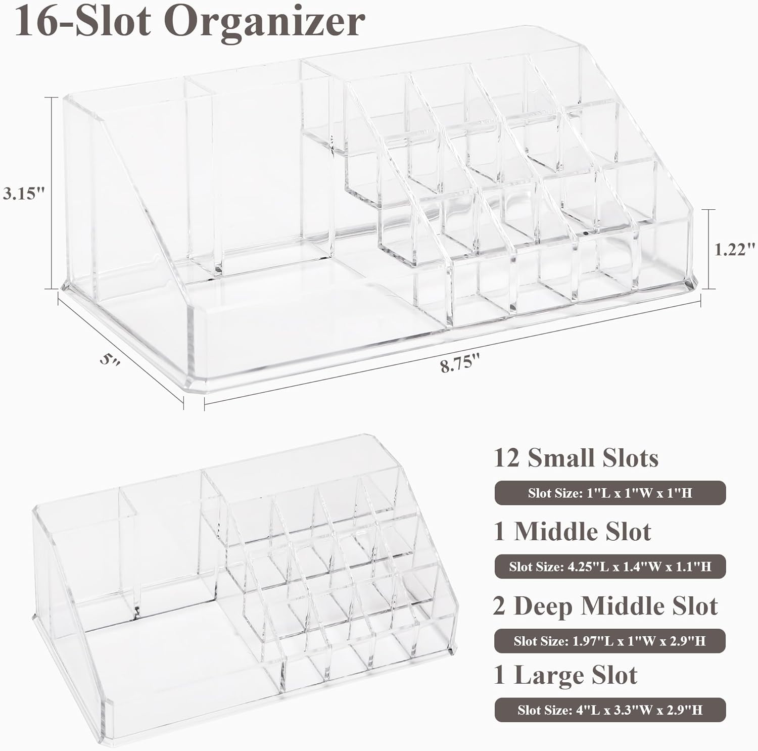 - DISPLAY & STORE BEAUTIFULLY - From lipsticks to cosmetics, this organizer is versatile enough to suit any storage needs. With 12 small, 3 medium and 1 large slots, you can store all your beauty essentials in one convenient place
