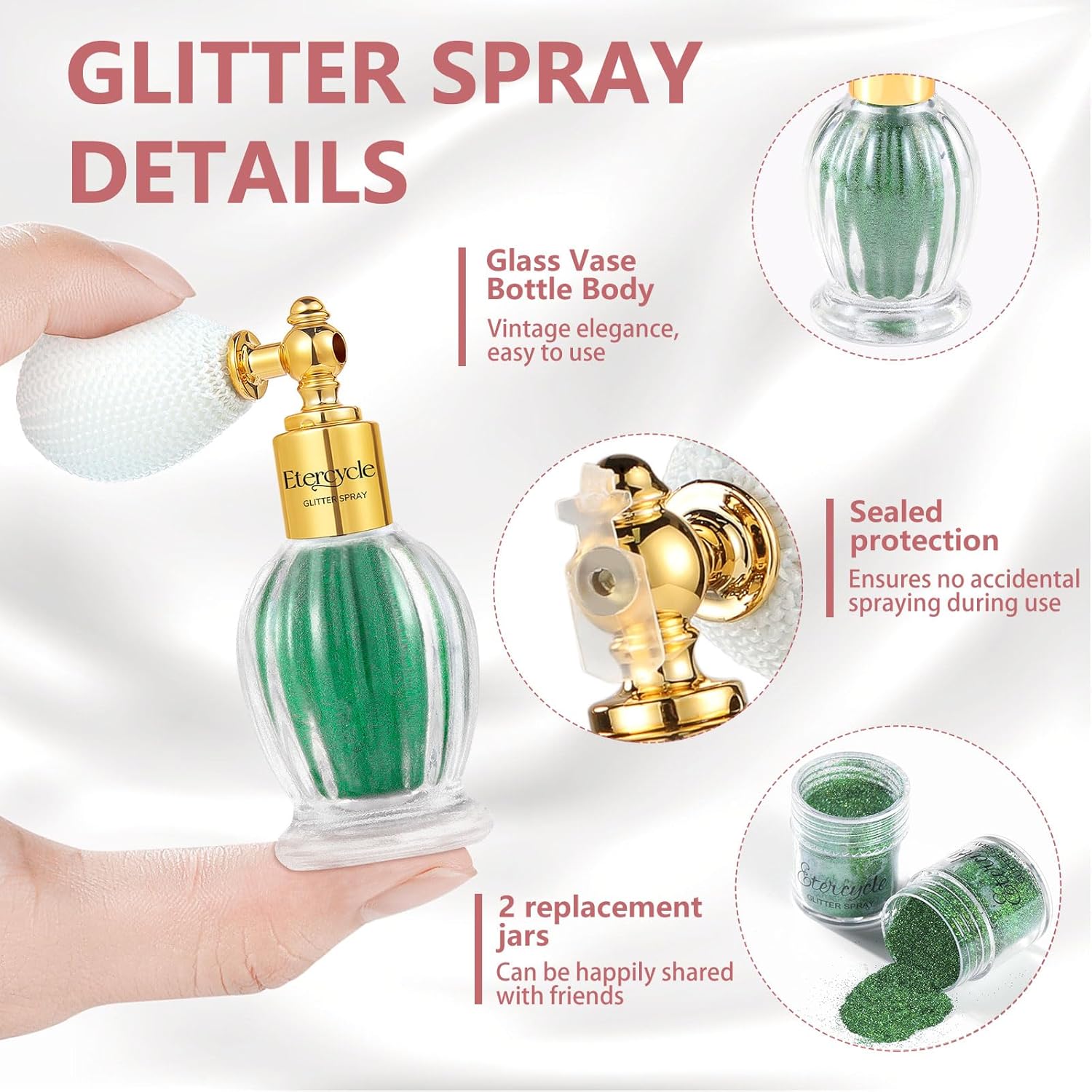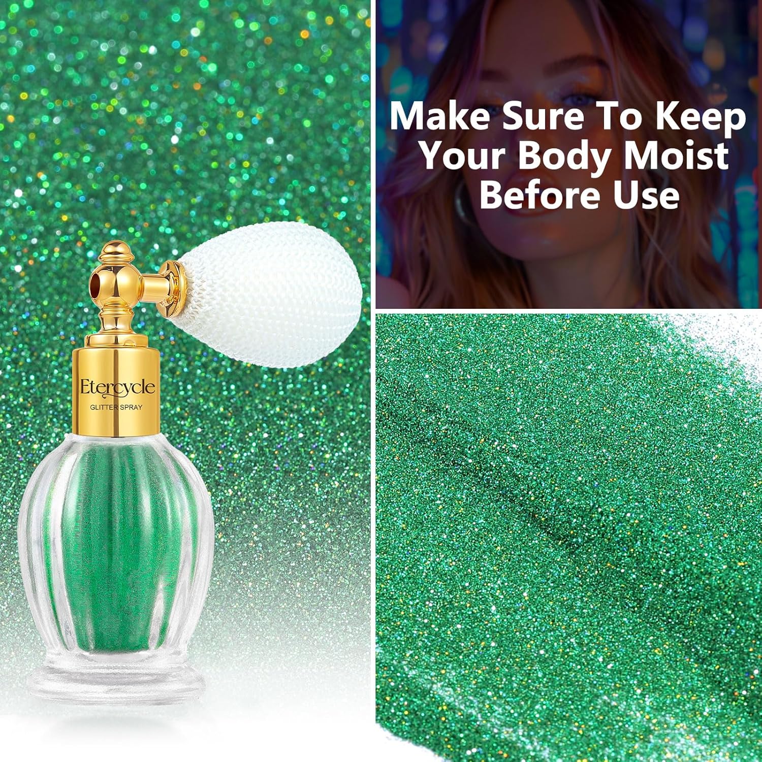 - Safe Body Glitter Spray: You can't tell if the cosmetic ingredients in other gel sequins are harmful to your skin, Etercycle Shimmering Spray Powder Sparkle Powder made of high-quality safe and healthy materials, is cruelty free without any animal tests.Glitter spray suits for all skin types and all ages, making your skin shiny, transparent and without block pores, while keeping skin breath freely and luster like the skin itself