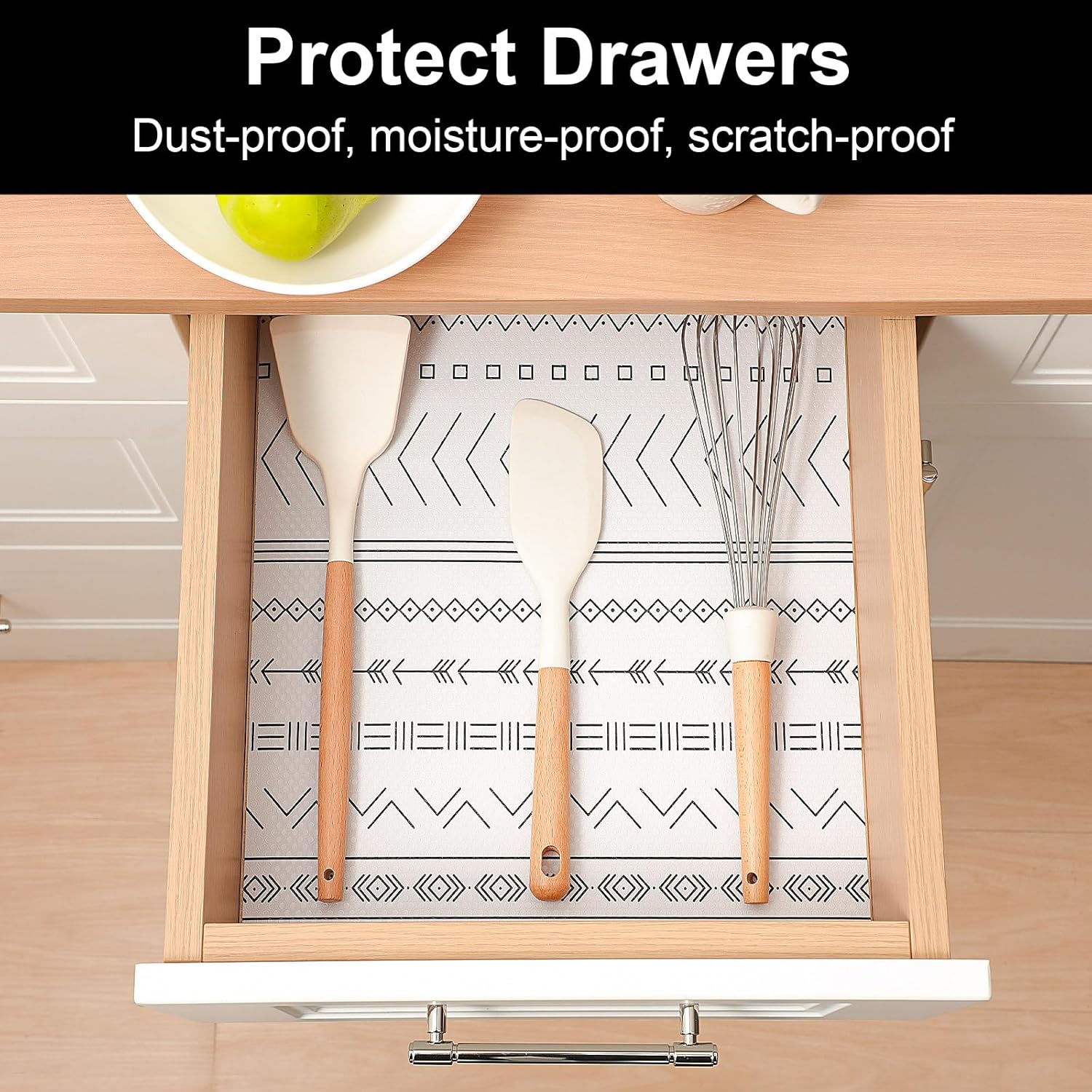 - WIDE RANGE OF USE: The drawer liner can be used in multiple areas of the home, providing surface protection in your home organization, cupboard, refrigerator, and bathroom. They can be used as kitchen liners to ensure cleanliness or as refrigerator mats to keep food and fruits fresh. They are also suitable as cabinet mats, drawer liners, cupboard pads, desk liners, and table pads.