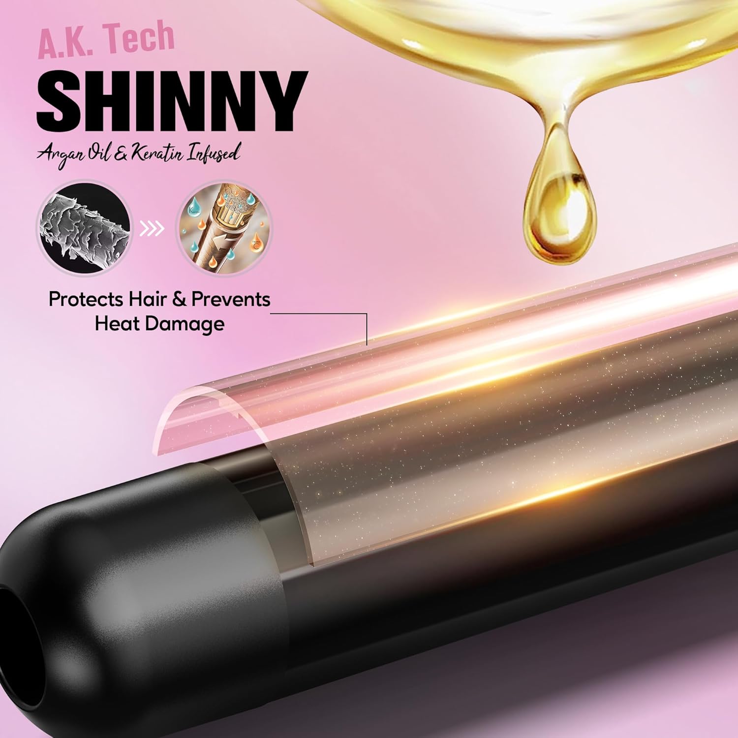 - A.K.T CERAMIC TECHNOLOGY: Argan oil & Keratin infused plates with moisturizing and nourishing properties leads to an shiny & less damage styling result. Tourmaline can release millions of negative ions to smooth down opened hair cuticles, seal in your hair’s own natural oils and moisture; Ceramic coating barrel distribute heat evenly to prevent heating damage