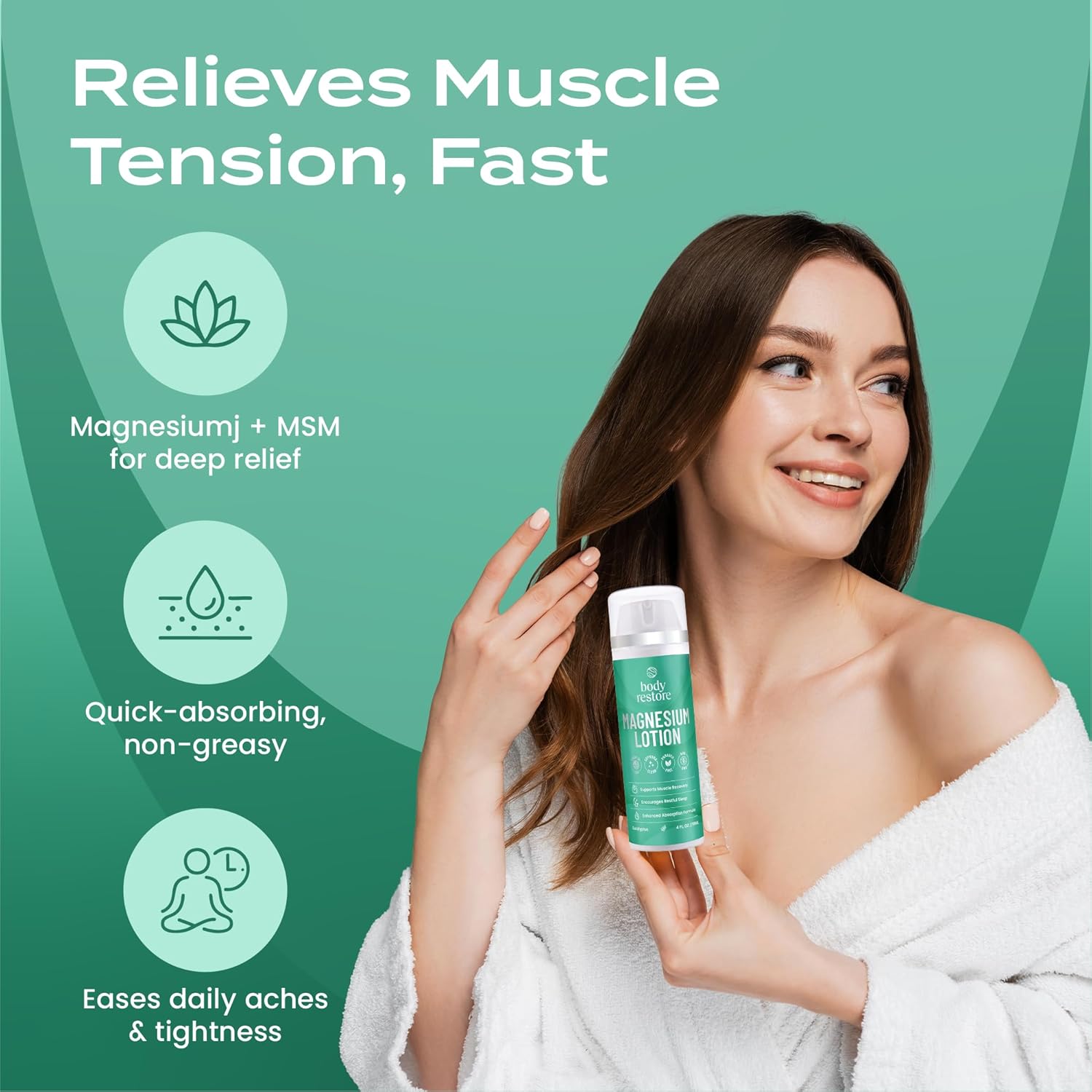 - Magnesium Lotion for Daily Relief: Fast-absorbing magnesium citrate infused with glucosamine chondroitin MSM and arnica to ease sore muscles and joints. A calming cream for women, men, or moms dealing with stress, tension, or restless nights.