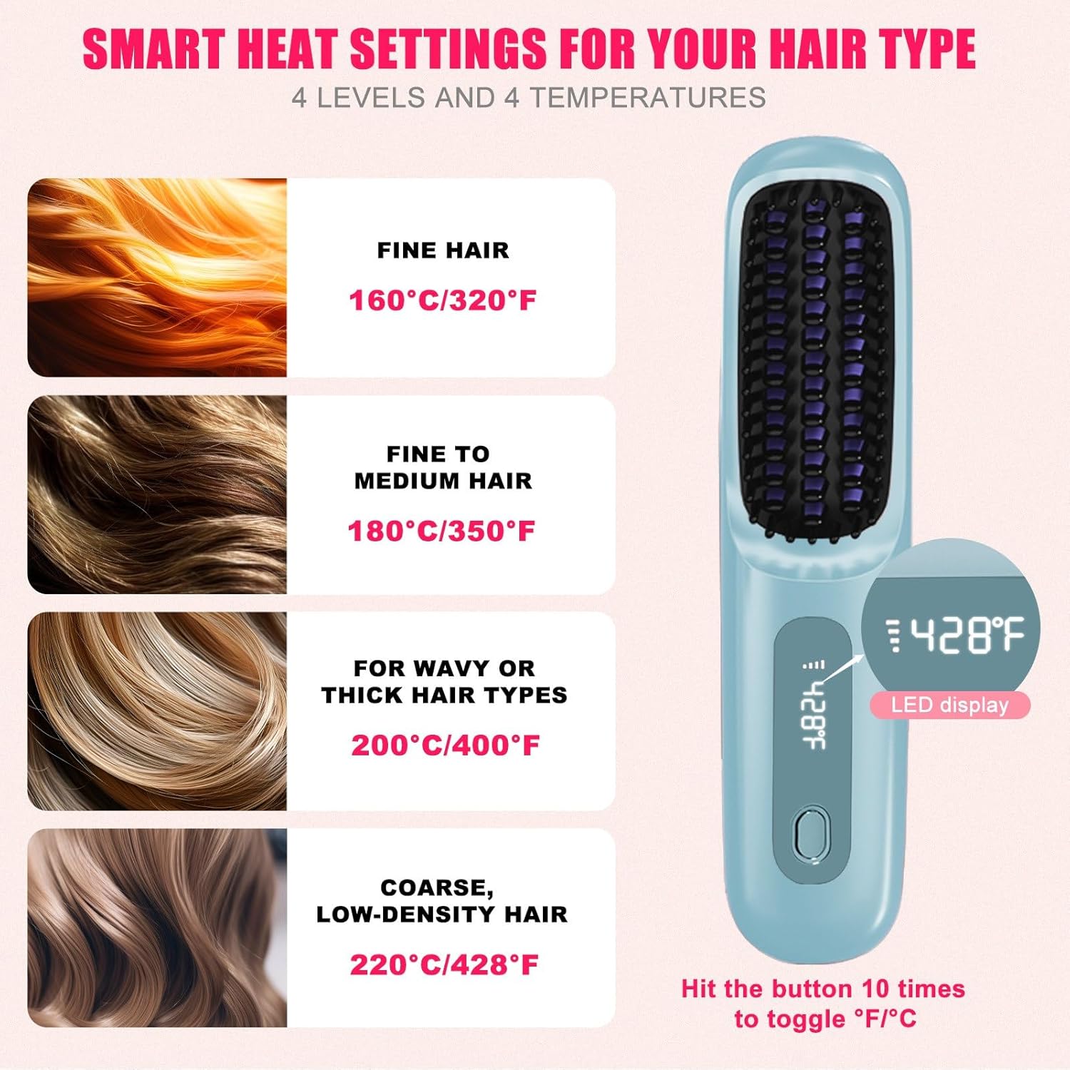 - 【199M FRIZZ-FIGHTING IONS & HAIR CARE】This mini straightening comb ceramic-coated bristles emit 199 million frizz-fighting ions, sealing the hair cuticle for a glossy finish. Proven to cause up to 80% less damage than traditional flat irons, the cordless straightener brush reduces frizz by over 90% for visibly healthier, shinier, all-day smoothness