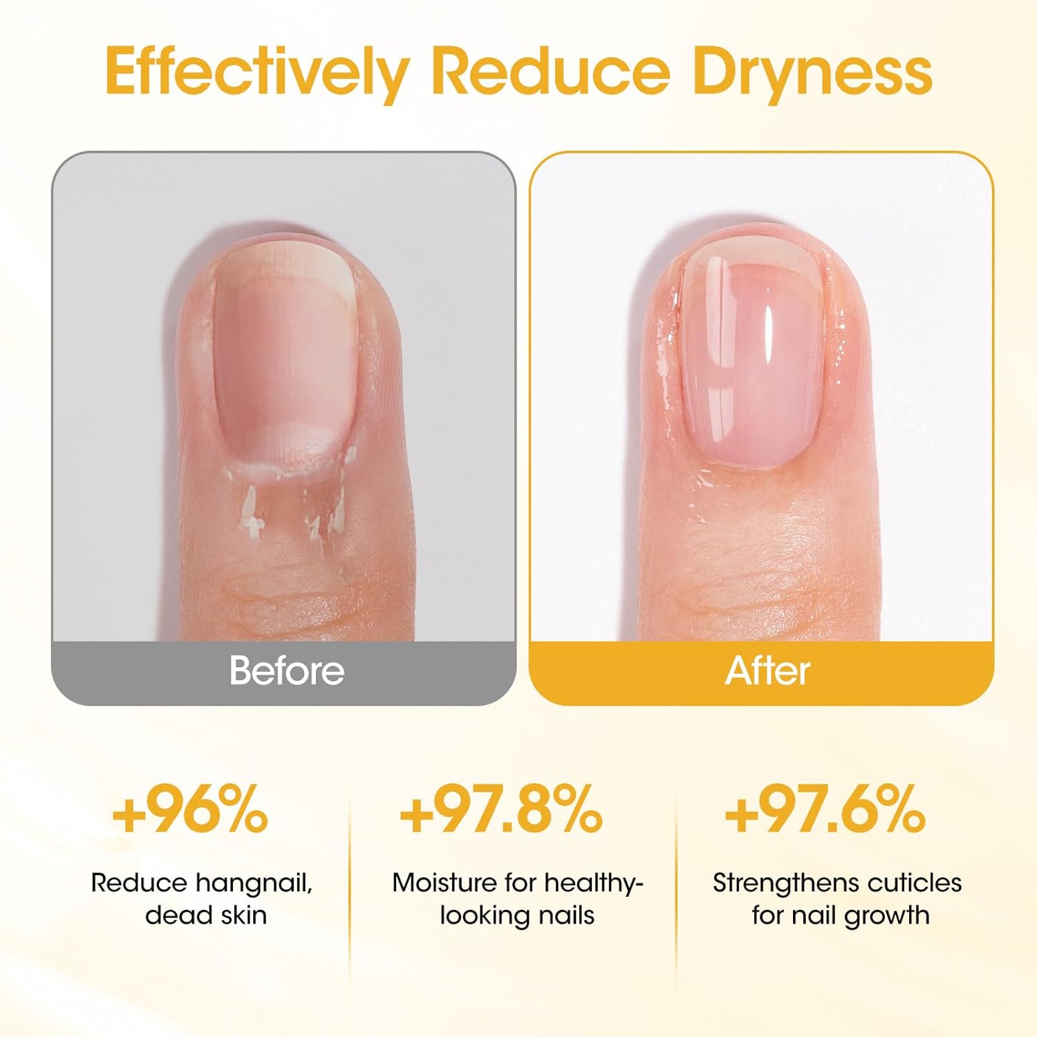 - 【Deep Hydration & Luxury Nourishment】A luxurious blend of organic lavender oil, Vitamin E, Jojoba oil, and silica. Softens dry, cracked cuticles, penetrates and hydrates breaking, thin nails while helping to maintain flexibility and reduce brittleness, and keeps fingertips smooth and hydrated.