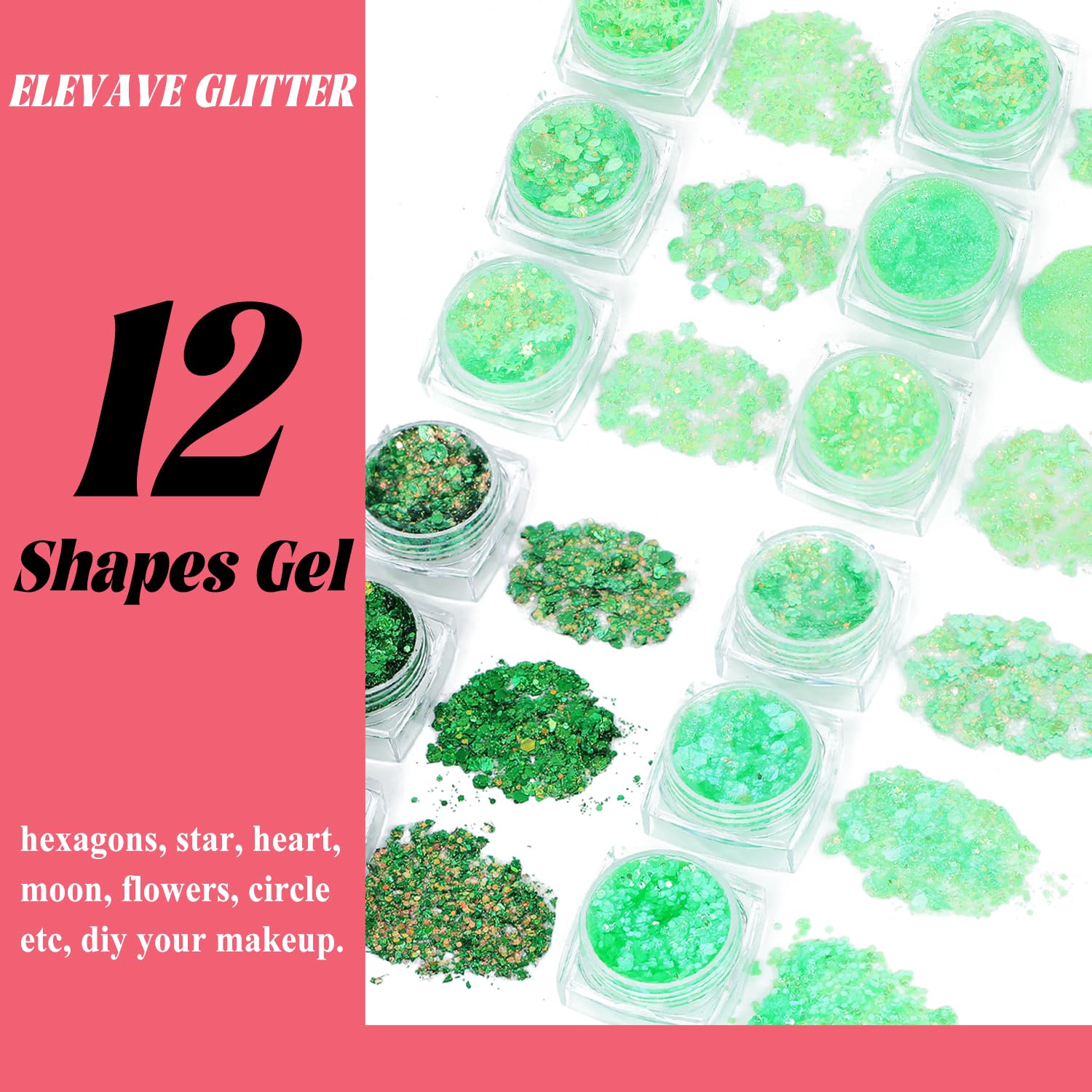 Body Glitter Face Glitter, Hair Glitter for Kids, 12 Shapes Fine Chunky Glitter Gel for Women Girls Makeup Sparkles Party Mermaid Sequins Rave Accessories Singer Concerts Festival (Green Scheme)
