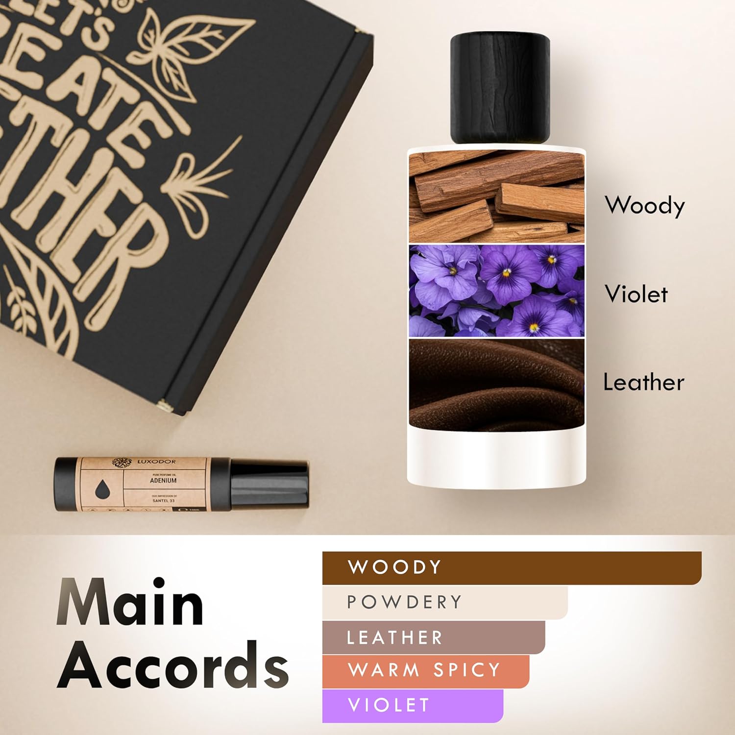 - Adenium, Inspired by S.antal 33 by Luxodor opens with sandalwood, leather, and papyrus. The heart features Virginia cedar and cardamom, settling into a soft base of violet, iris, and amber. This perfume blends earthiness and elegance, standing strong among unisex fragrances and signature woody perfumes.
